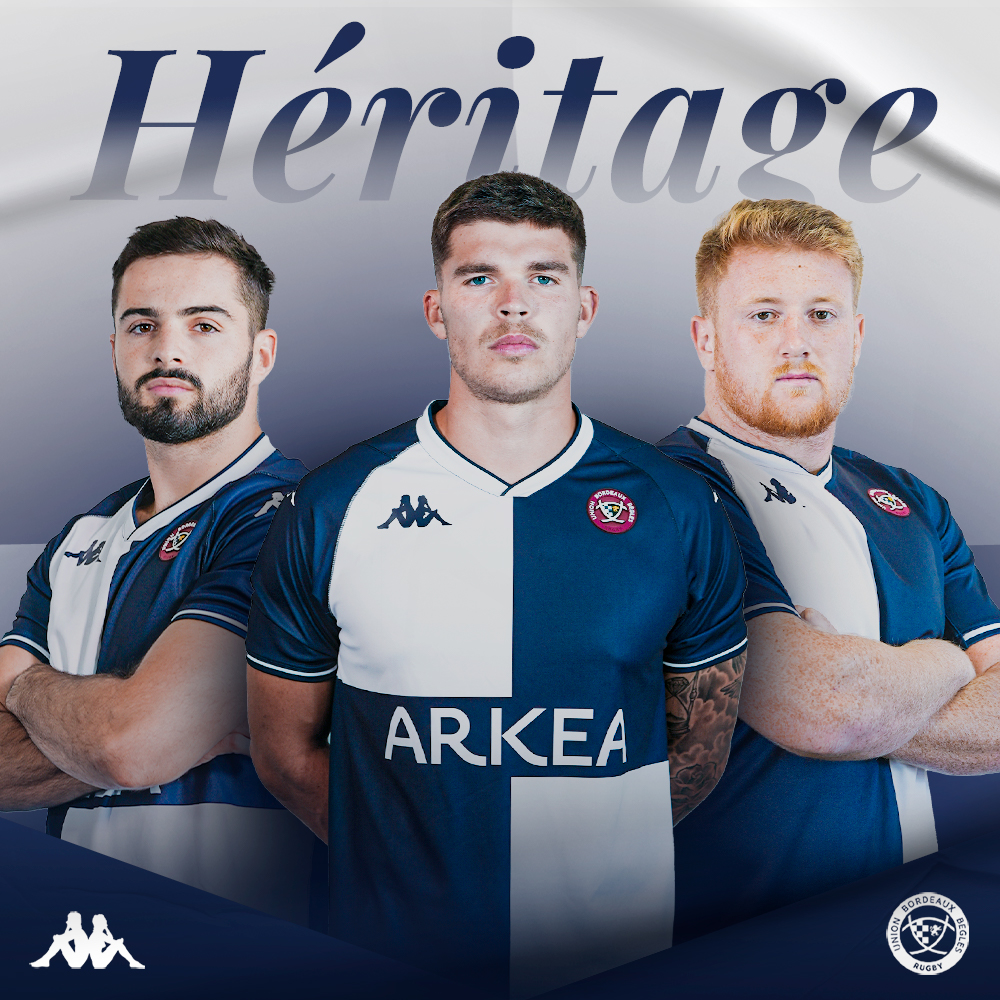Trois joueurs de l’équipe première, purs produits de la formation béglaise, posent en photo avec le maillot « Héritage » : Matthieu Jalibert, auteur d’une magnifique saison en club comme avec le XV de France, et ses coéquipiers et amis Maxime Lamothe et Jules Gimbert, champions du monde U20 en 1998.