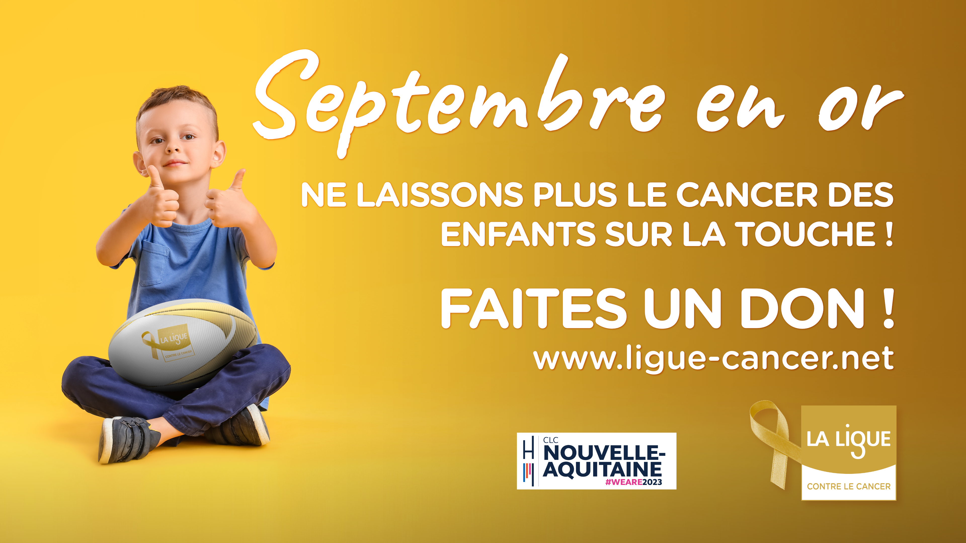 A deux ans de la coupe du monde de rugby qui se déroulera en France à partir de septembre 2023, et avec la confiance du Comité d’organisation, le Comité local de coordination de Nouvelle Aquitaine et l'UBB mettent en lumière "Septembre en or", une opération internationale de lutte contre le cancer des enfants. Venez découvrir les animations proposées à Chaban ce samedi !