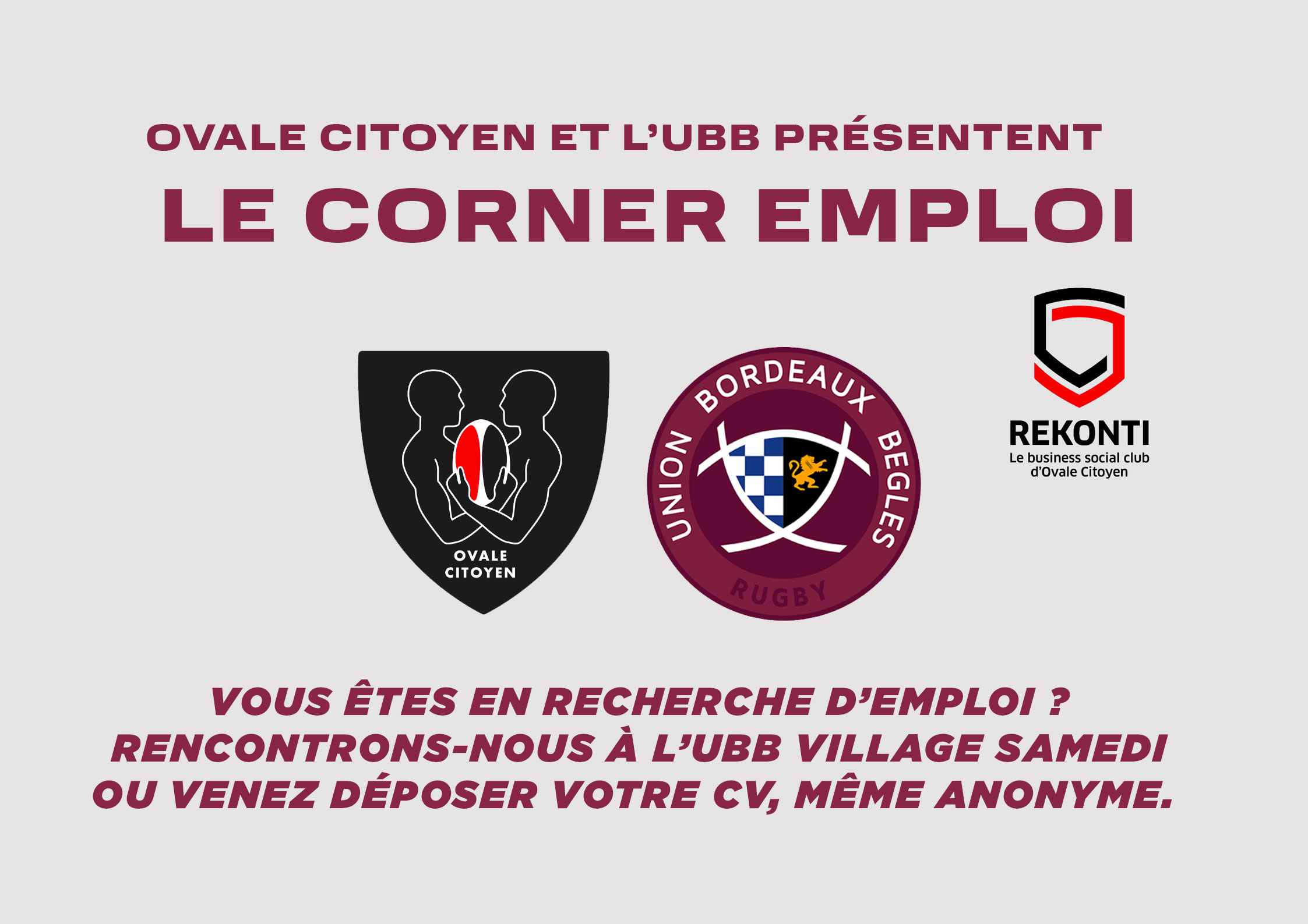 Pour cette 4e journée de Top 14, l’Union Bordeaux Bègles et Ovale Citoyen mettent en place un « corner pour l’emploi ». Pour la première fois, un service « Emploi » vous est proposé. Il s’agit pour l'UBB d’offrir un service complémentaire à son public, et pour les entreprises partenaires du club de pouvoir recruter de façon innovante. Venez rencontrer les conseillers emplois de l’Association Ovale Citoyen au Village UBB by McDo !