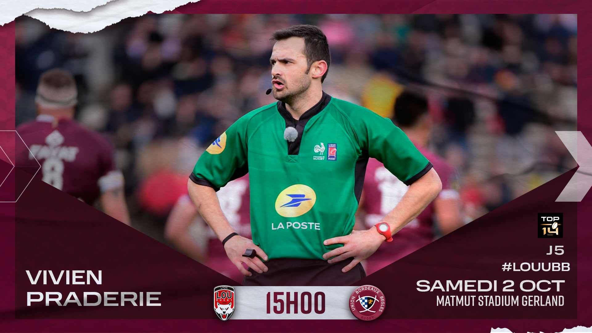 Ce sera M. Praderie qui tiendra le sifflet samedi à 15h00 au Matmut Stadium Gerland pour LOU - UBB. Il sera assisté de M. Brousset et M. Gabaldon sur les touches ainsi que par M. Briquet-Campin à la vidéo.