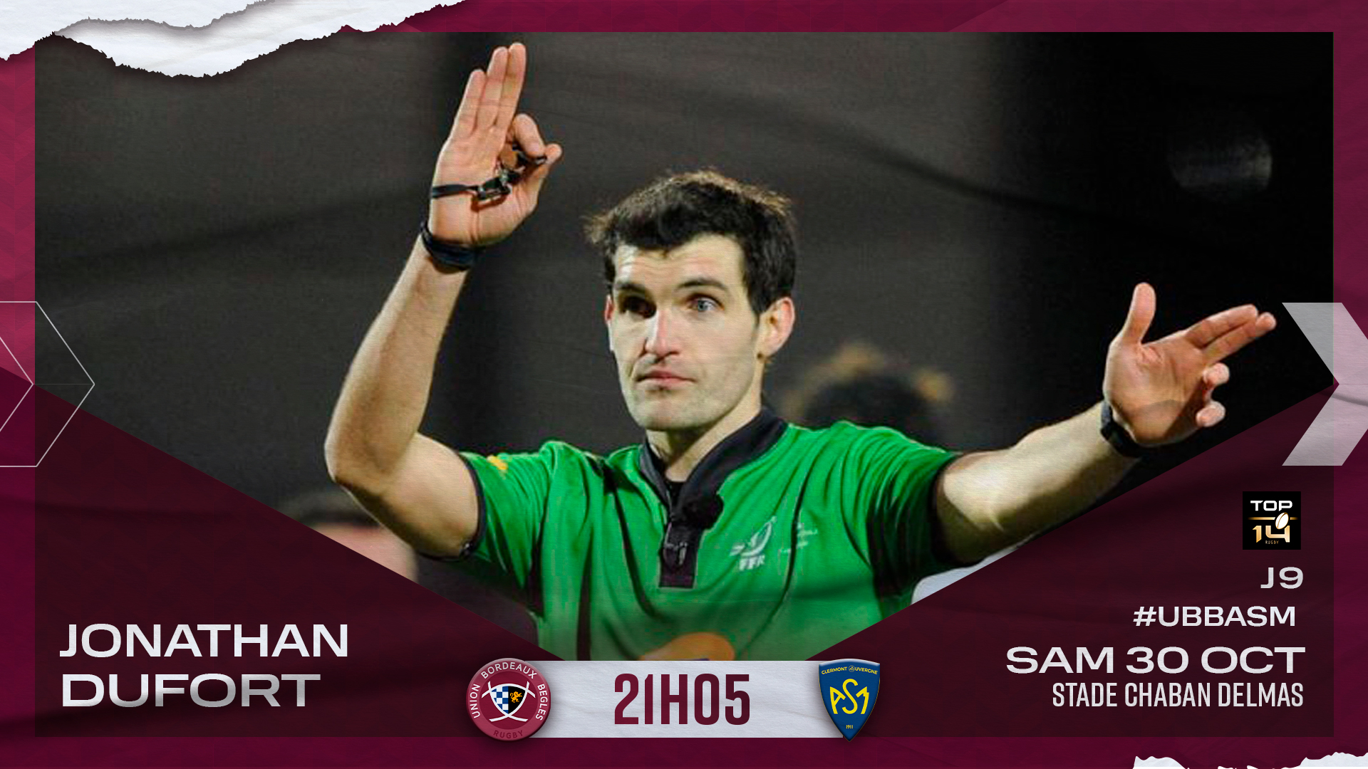 M. Dufort tiendra le sifflet samedi soir pour la réception de Clermont à Chaban. Il sera assisté de M. Marchat et M. Millotte sur les touches ainsi que M. Zitouni à la vidéo.