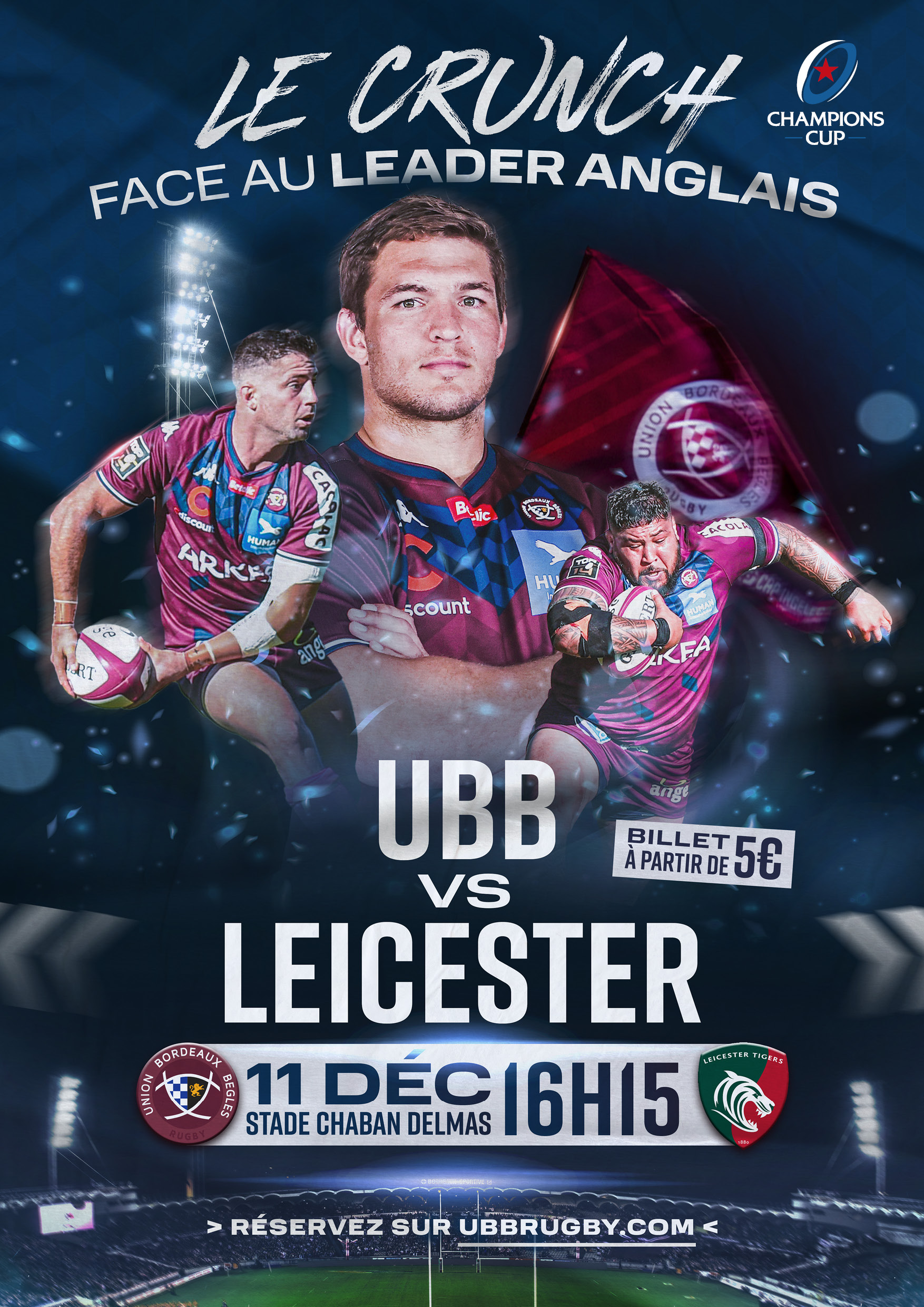 Pour rappel, le match actuellement disponible à la vente est le choc qui opposera l'UBB au leader du championnat anglais, Leicester Tigers en ouverture de la Champions Cup, samedi 11 décembre à 16h15.