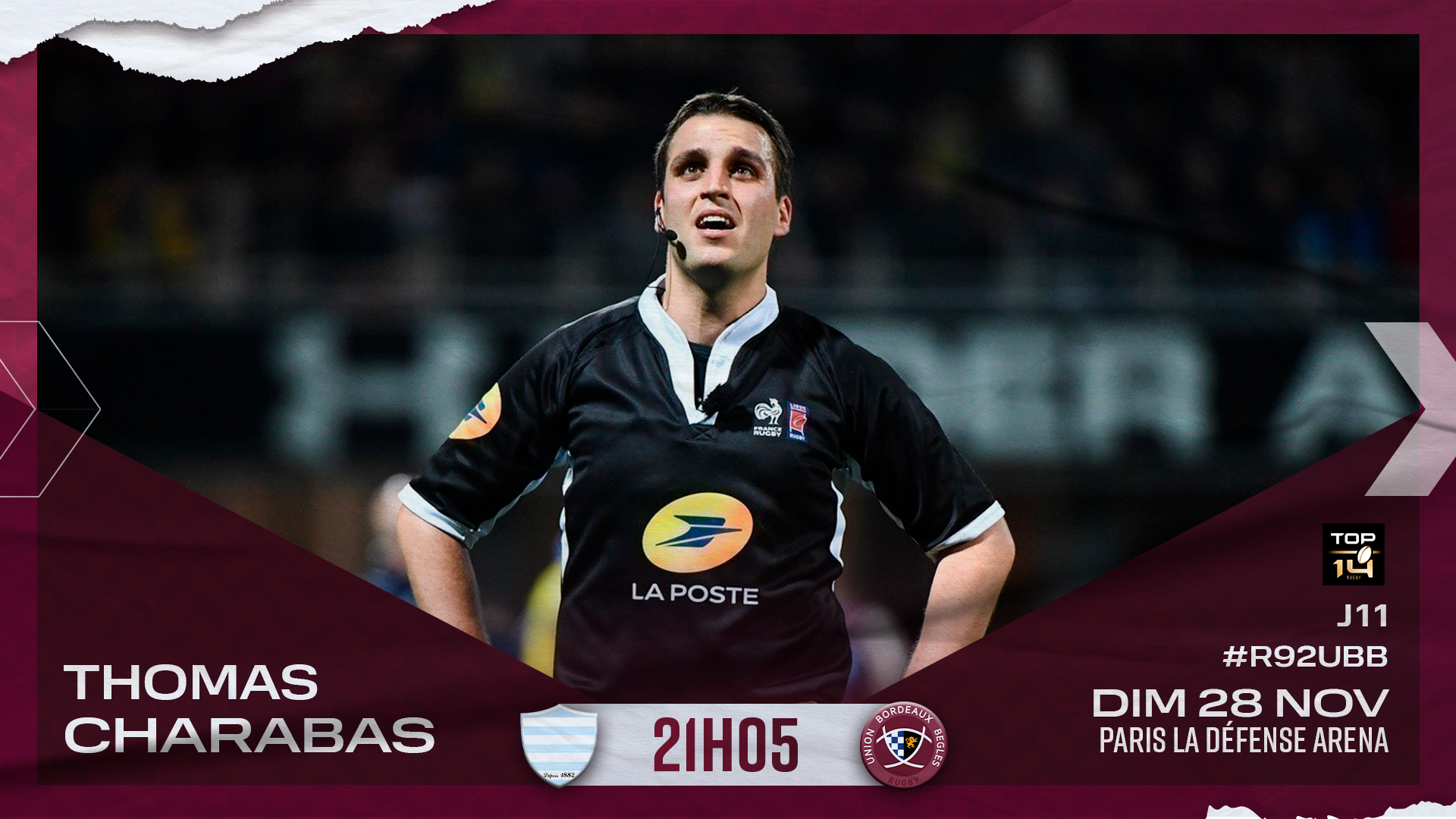 M. Charabas tiendra le sifflet pour Racing 92 - UBB, dimanche 28 novembre à 21h05 à l'occasion de la 11e journée de Top 14. Il sera assisté par M. Marchat et M. Bultet sur les touches ainsi que par M. Briquet-Campin à la vidéo.
