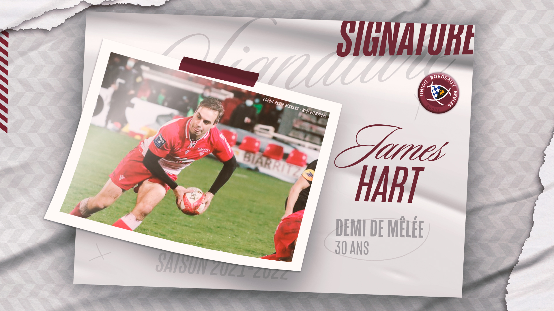 Le demi de mêlée James Hart (30 ans, 1,78m, 82kg) rejoint l'Union Bordeaux Bègles en prêt en provenance du Biarritz Olympique. Il palliera l'absence de Jules Gimbert (rupture du ligament croisé) et rejoindra le Ceva Campus dès ce lundi 29 novembre.