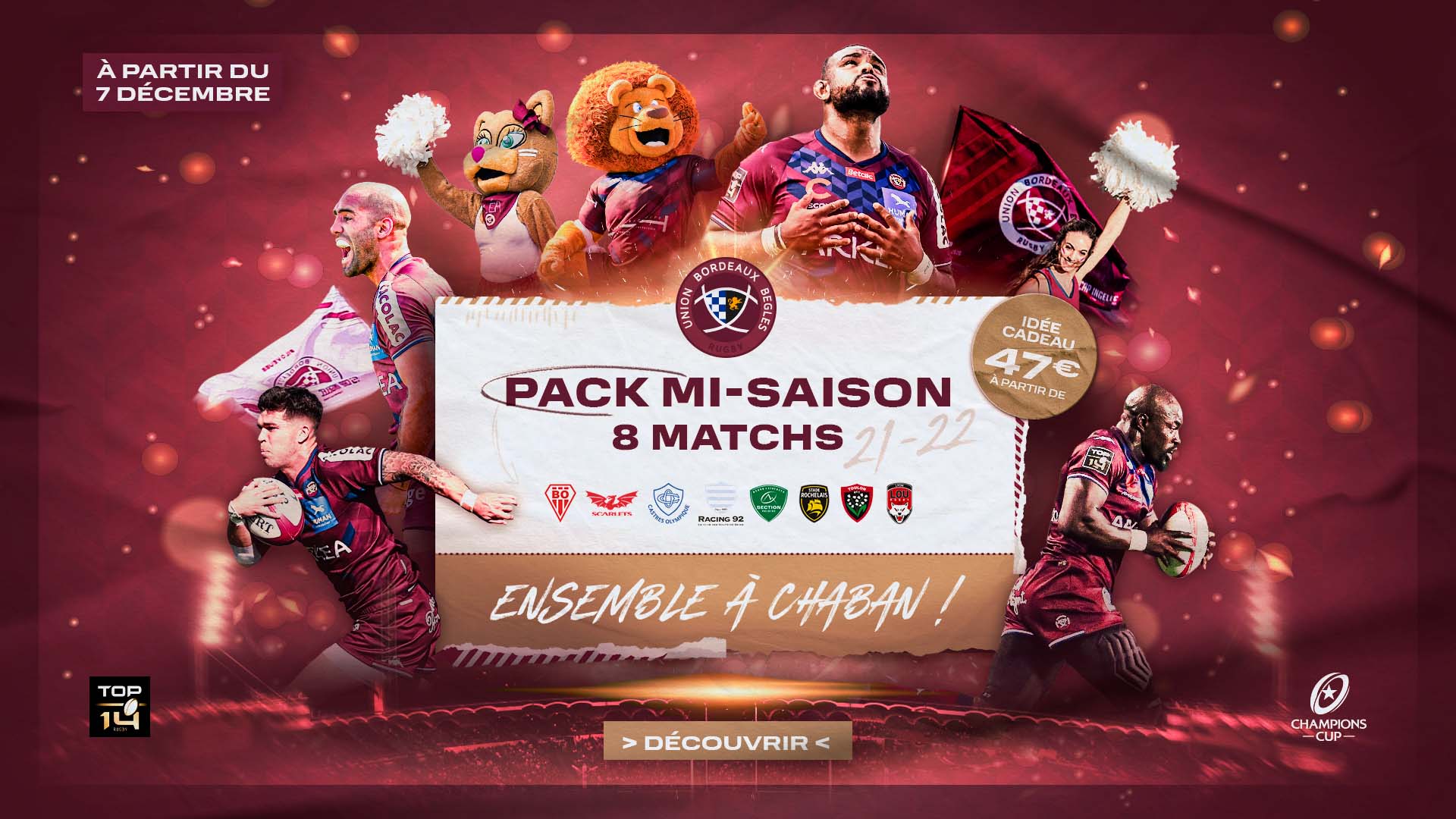 Le pack mi-saison est bientôt prêt pour garnir votre sapin de Noël ! Réservez vos 8 matchs dès le 7 décembre et vivez l'ambiance de Chaban à partir de 47€. Ne manquez rien de la fin de saison de l'UBB !