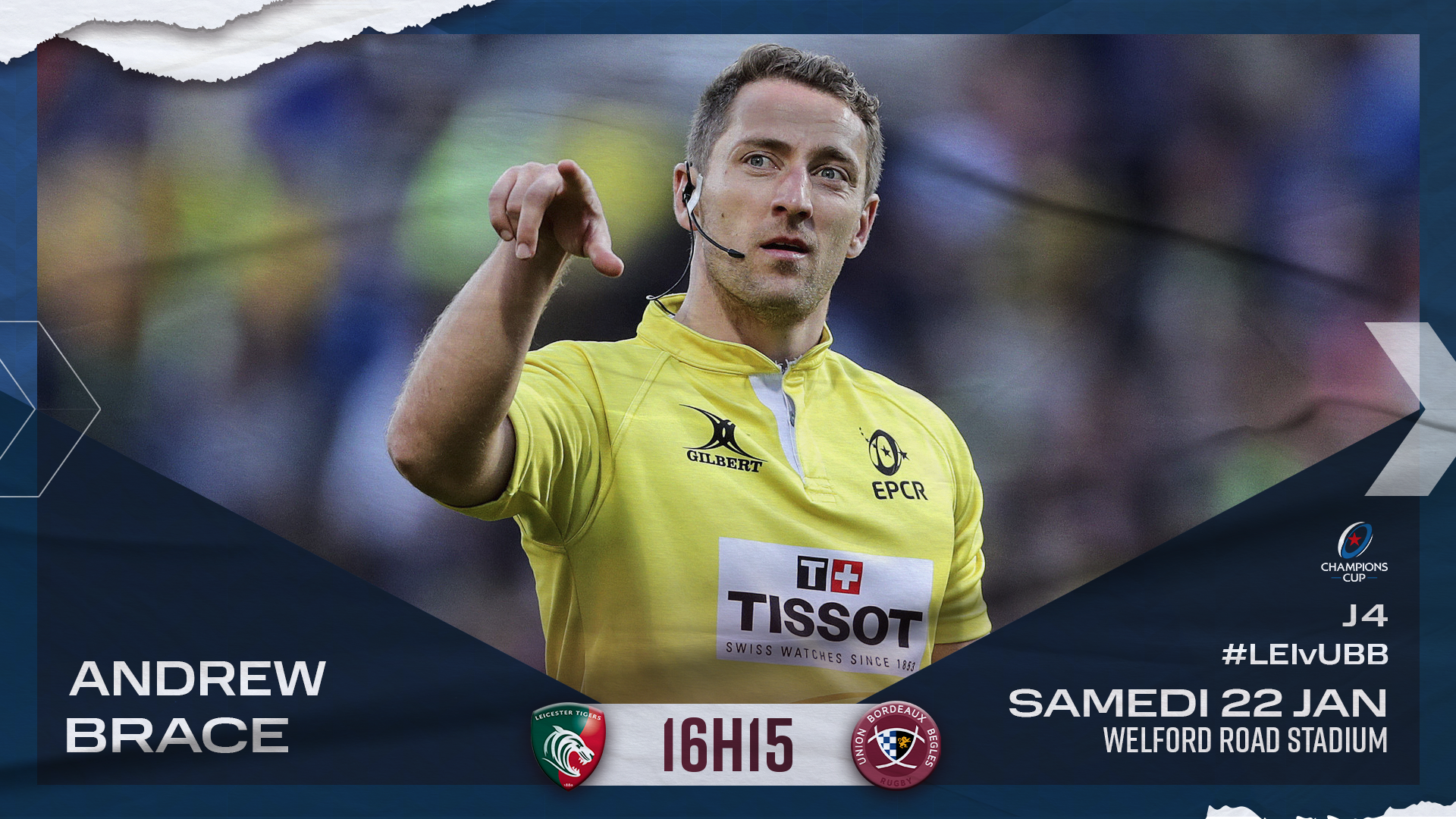 L'EPCR, qui avait initialement désigné Mr Amashukeli pour arbitrer Leicester Tigers - UBB ce samedi à l'occasion de la 4e journée de Champions Cup, a apporté des modifications au corps arbitral : c'est Mr Brace qui arbitrera finalement la rencontre. Il avait déjà dirigé le match aller à Chaban.