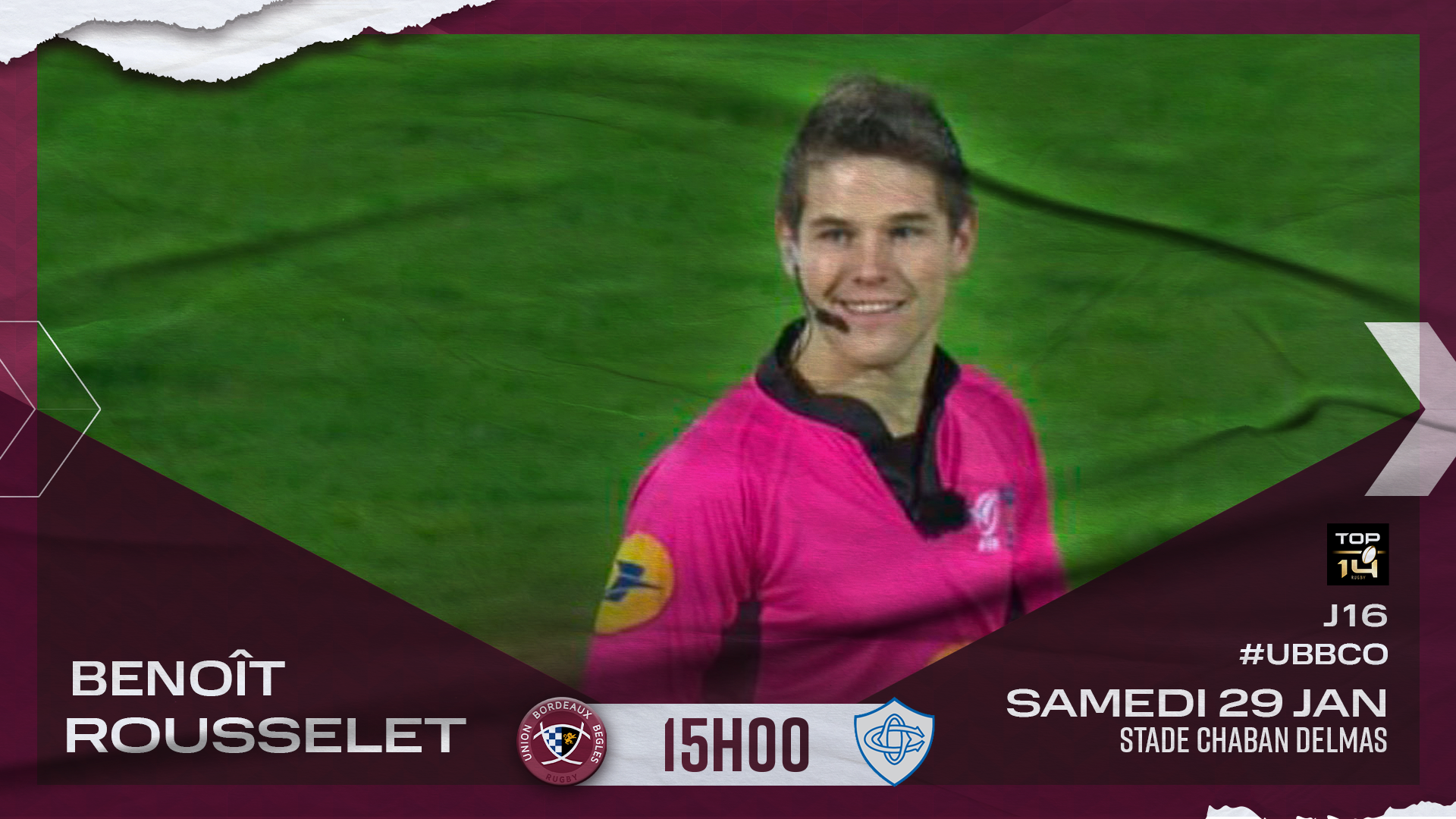 M. Rousselet sera assisté de M. Trainini et M. Bultet sur les touches pour la réception de Castres, samedi 29 janvier à 15h00 à Chaban, lors de la 16e journée de Top 14 ainsi que par M. Briquet Campin à la vidéo.