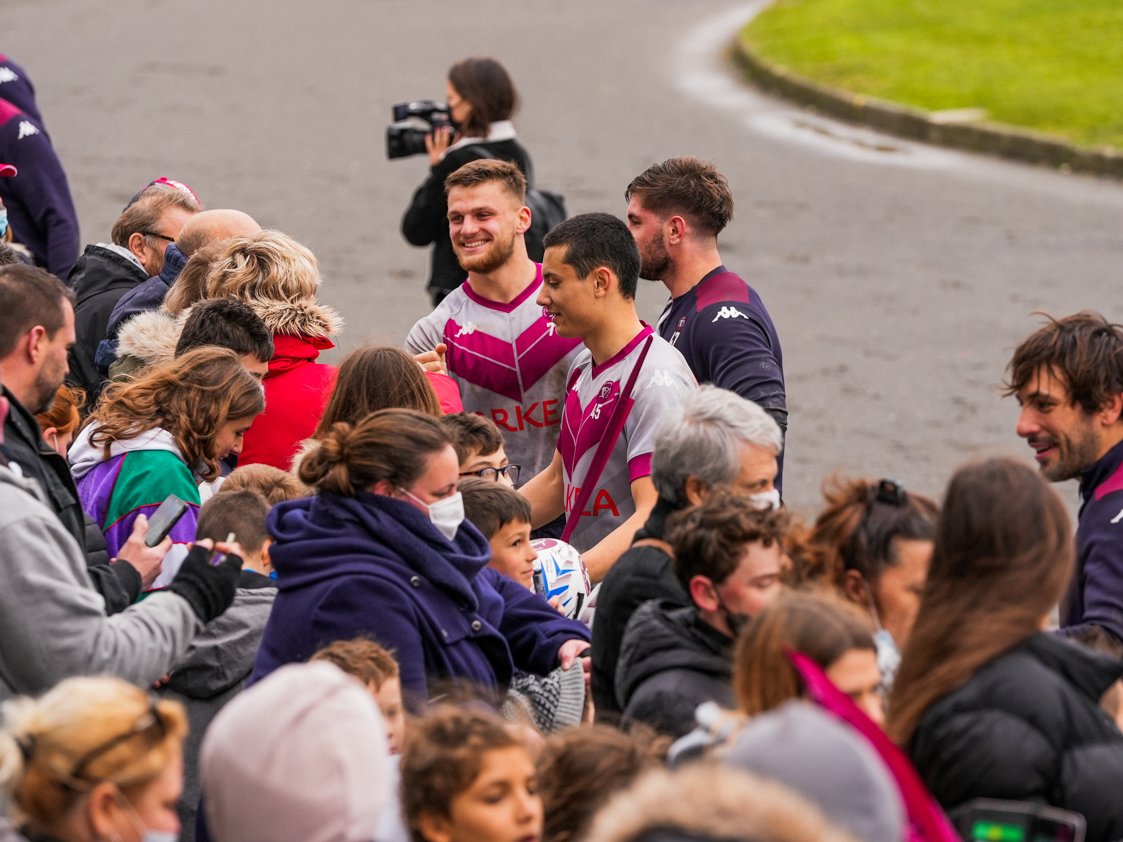 Les joueurs de l’UBB se sont rendus au stade Guyon, fief du CM Floirac, ce mercredi 16 février 2022 pour un entraînement délocalisé en vue de la préparation de la réception du Racing 92. Malgré un temps maussade 500 supporters sont venus garnir la tribune et les mains-courantes du terrain afin de soutenir nos Girondins et de partager un moment avec eux à l'issue de la séance.