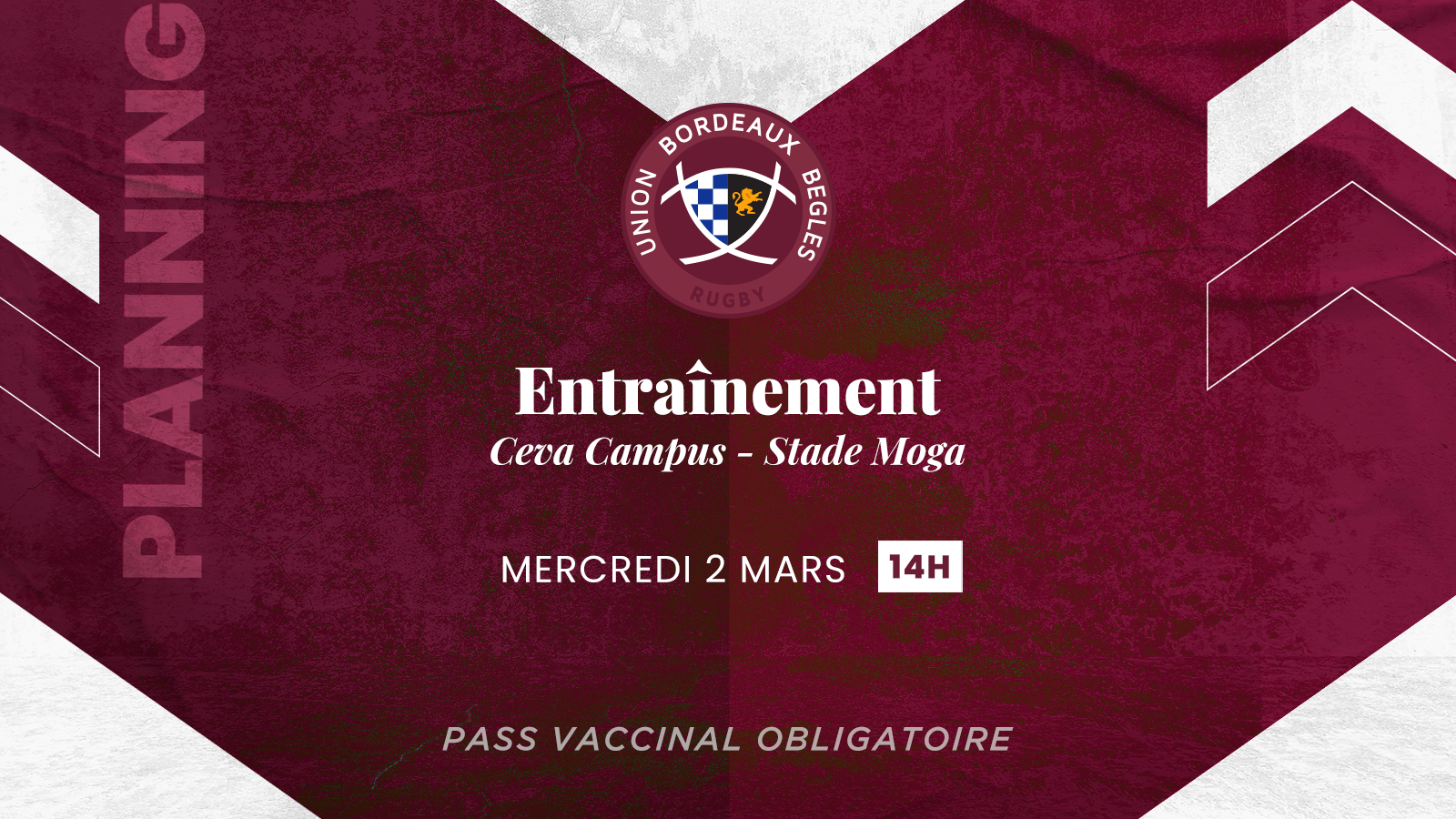 Venez soutenir les Bordeaux & Blanc lors de la séance d'entraînement ouverte au public au Ceva Campus - Stade Moga avant la réception de la Section Paloise, samedi 5 mars !