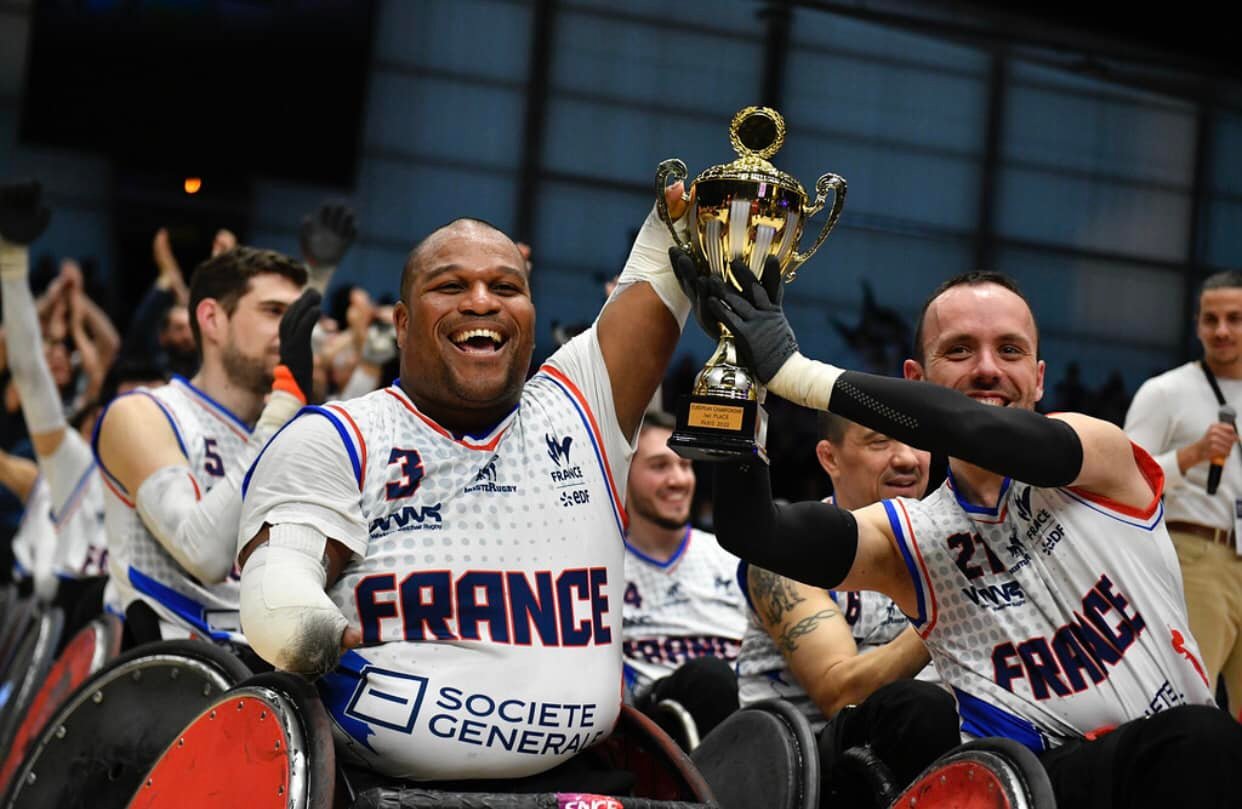 Le 26 février dernier à Paris, l’équipe de France de rugby fauteuil a battu en finale de championnat d’Europe la Grande-Bretagne sur le score de 44 à 43. Il s’agit du premier titre majeur de cette équipe de France.