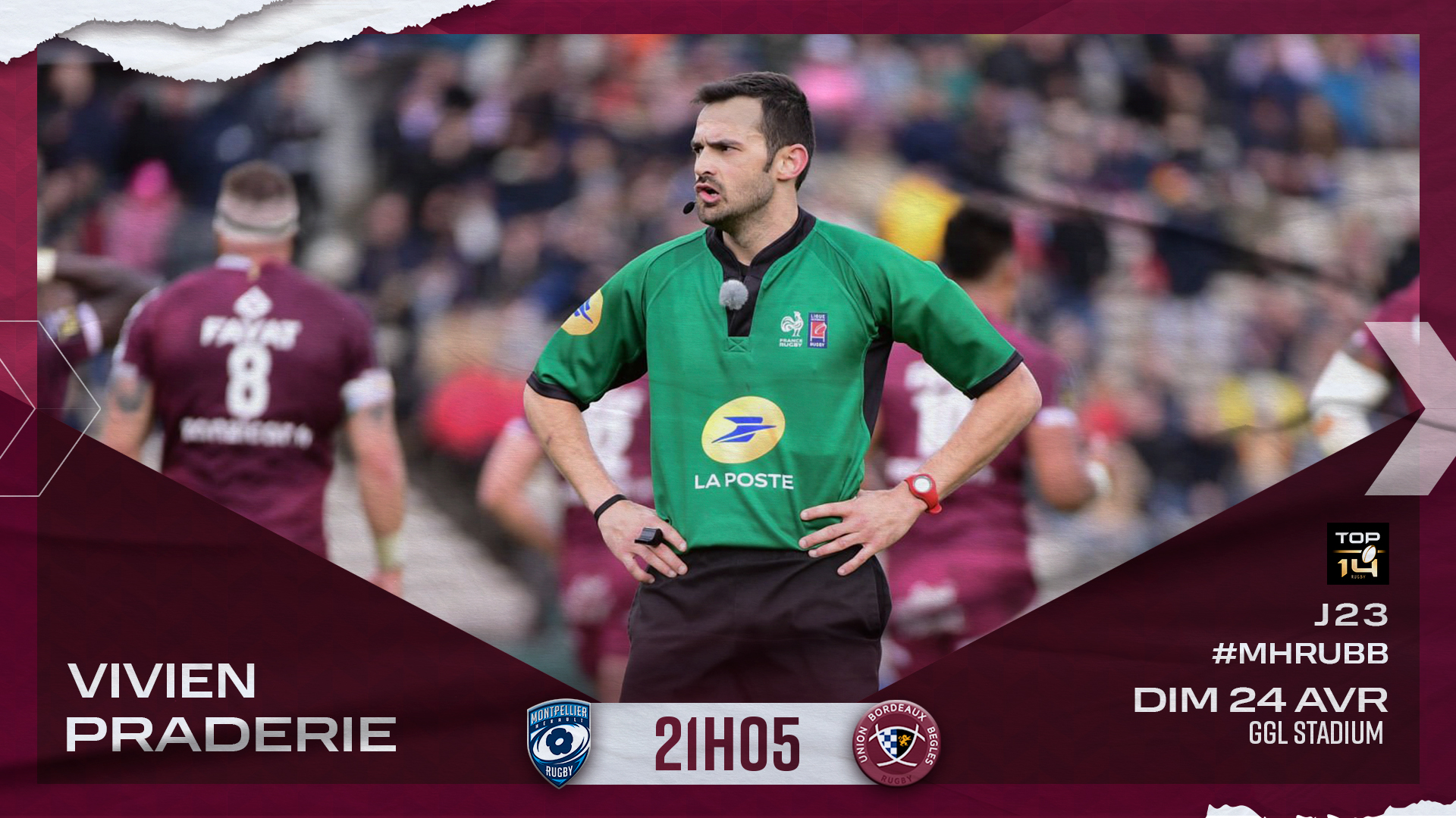 À l'occasion de la 23e journée de TOP 14, la LNR a désigné M. Vivien Praderie pour arbitrer Montpellier - UBB, ce dimanche 24 avril à 21H05.
