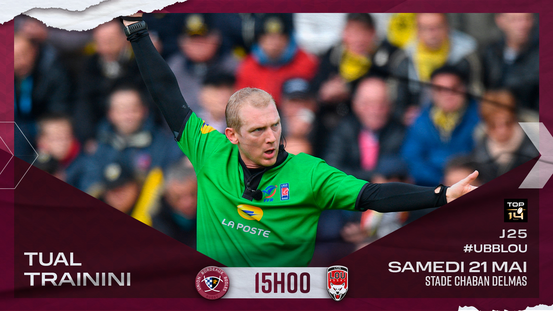 M. Trainini arbitrera le match UBB - LOU à Chaban, ce samedi 21 mai à 15h00. Il sera assisté de M. Rousselet et M. Duhau sur les touches ainsi que par M. Briquet-Campin à la vidéo.