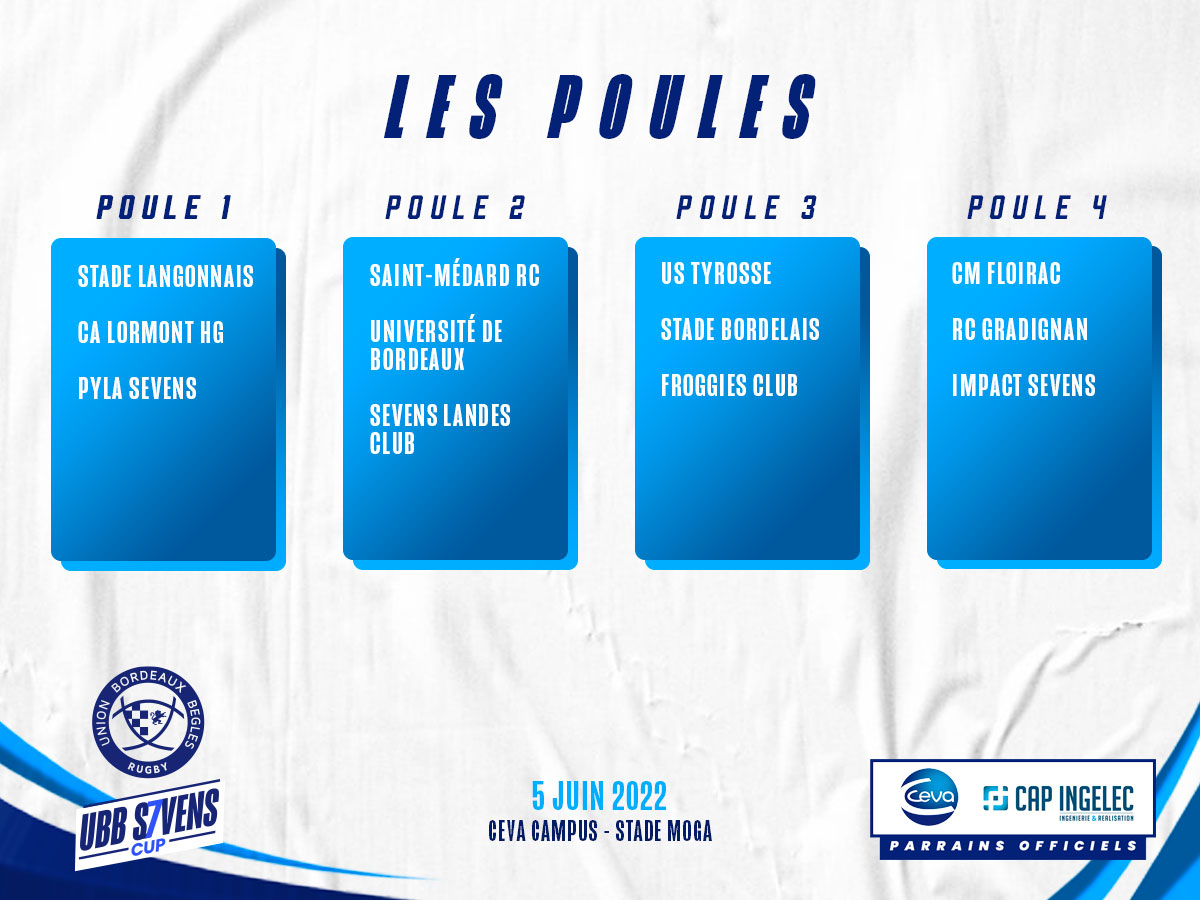 Rendez-vous est donné dimanche 5 juin, de 10h00 à 20h30, au Ceva Campus - Stade Moga à Bègles pour un tournoi de Seven où 12 équipes issues des clubs locaux se disputeront l'UBB S7VENS CUP, parrainée par Ceva et Cap Ingelec. Le Tournoi sera précédé de l'ETI SEVENS CUP, un tournoi dédié aux entreprises de taille intermédiaires (ETI).