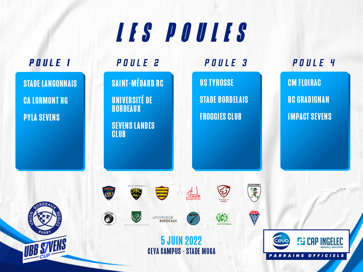 Douze équipes de jeunes de plus de 18 ans issus de clubs girondins, landais et de sélections Sevens s'affronteront ce dimanche 5 juin de 10h à 20h30 pour remporter le bouclier de l'UBB SEVENS CUP.