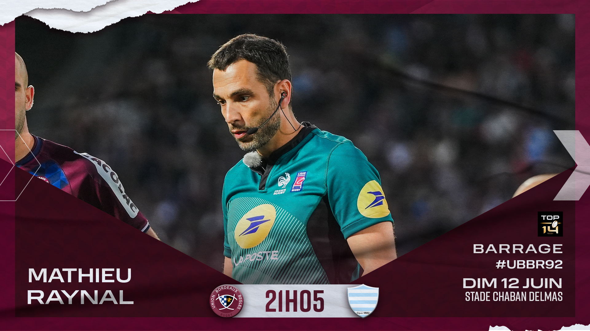 M.Raynal tiendra le sifflet et sera assisté de M. Chalon et M. Gabaldon sur les touches pour la réception du Racing 92, dimanche 12 juin à 21h05, à l'occasion des barrages, ainsi que par M. Bouhoure à la vidéo.