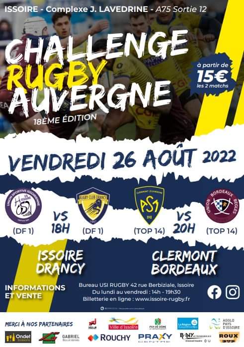 Pour leur second et dernier match de préparation estivale, vos joueurs seront en déplacement à Issoire, au complexe J. LAVEDRINE, pour une rencontre en terre auvergnate face aux Clermontois de l'ASM. Coup d'envoi le vendredi 26 août à 20h.
