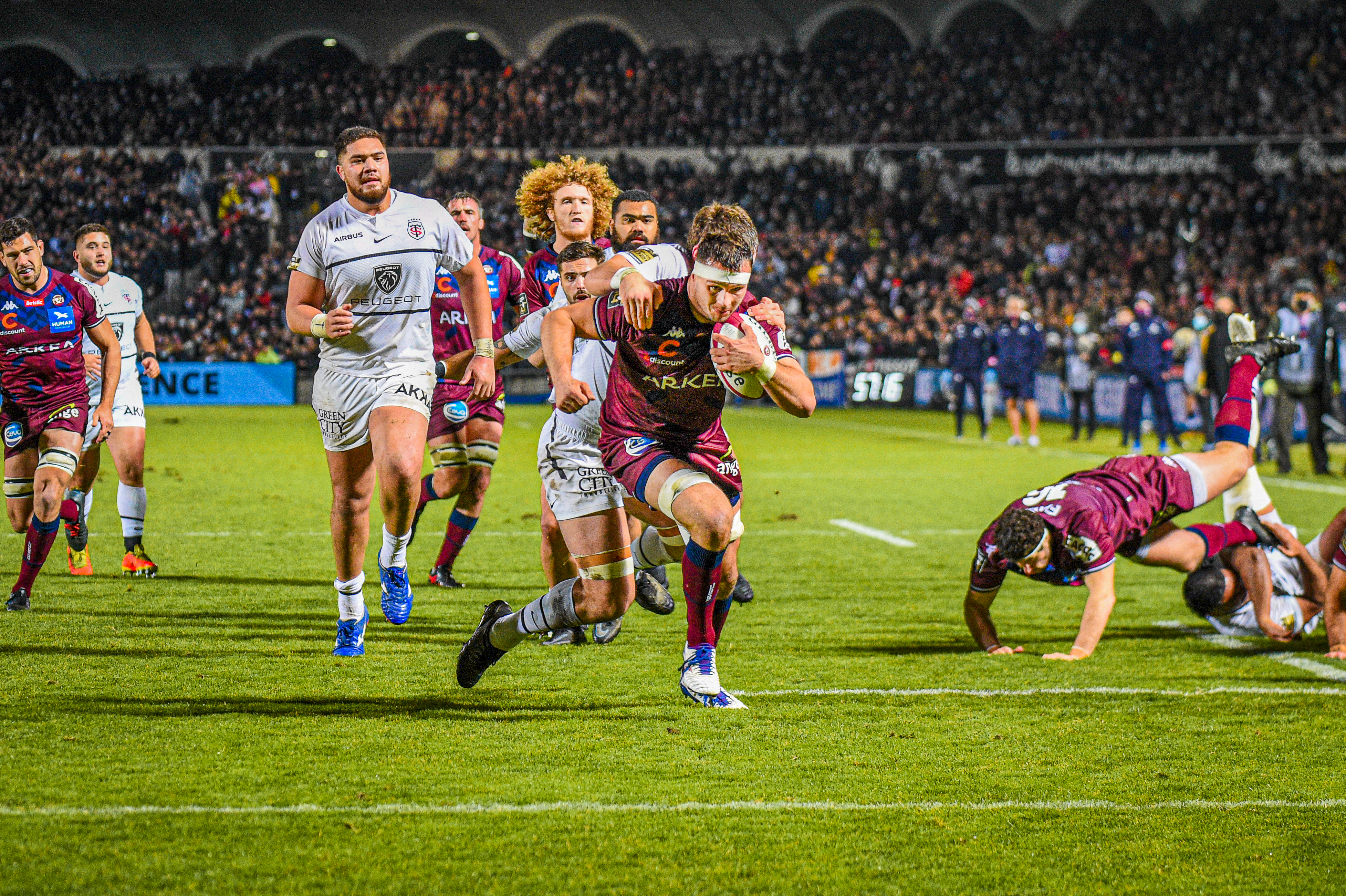 Bastien Vergnes inscrivant l'essai décisif qui scellera la victoire de l'UBB face au Stade Toulousain à Chaban en décembre 2021.