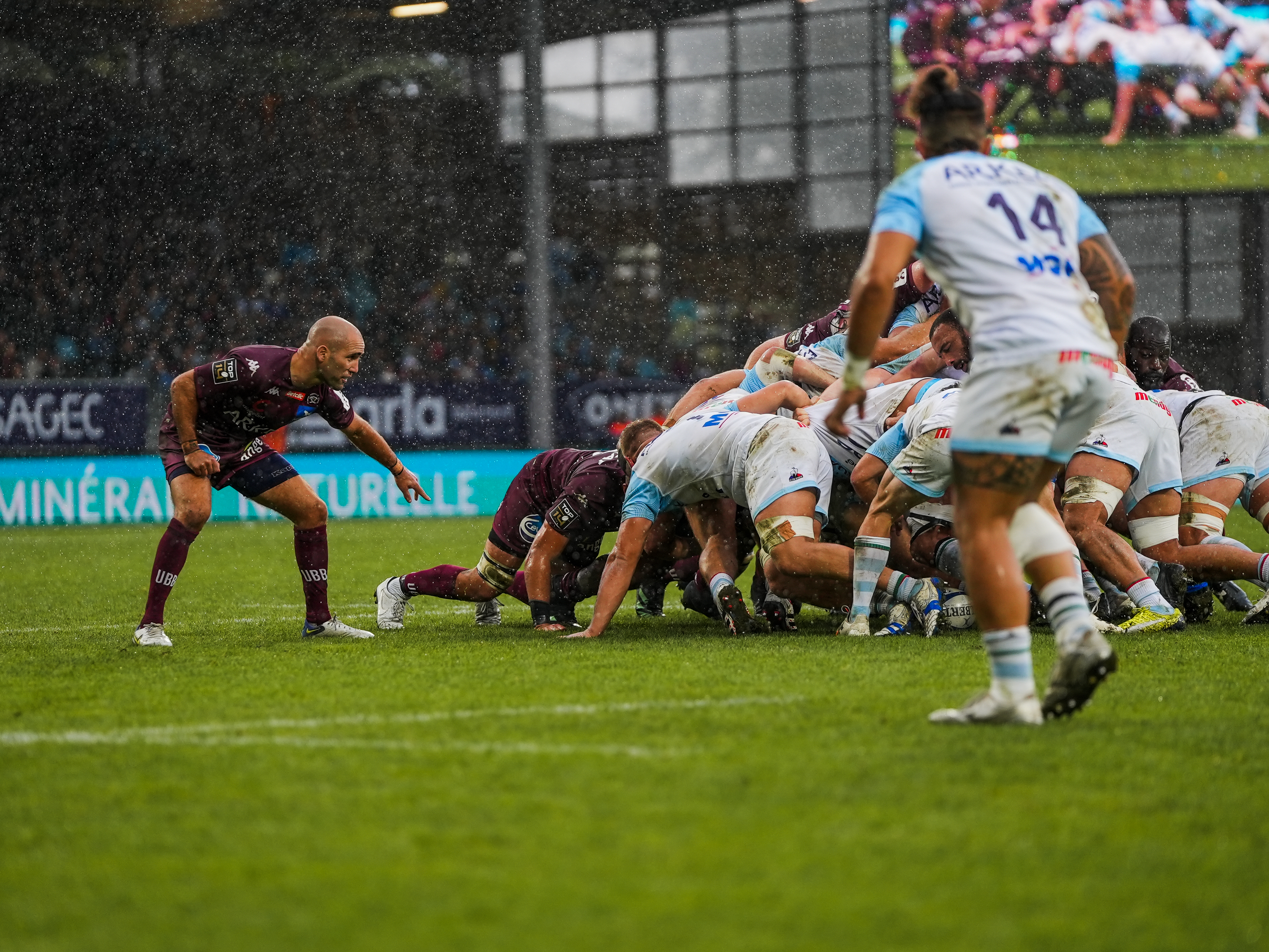 À deux minutes de la fin de la première période, beaucoup de fautes des deux côtés mais l’arrière bayonnais venait ajouter 3 points supplémentaires et revenait à une unité des girondins. Les girondins se retrouvaient en infériorité numérique suite à un carton jaune de Ben Tameifuna, et Bayonne en profitait en inscrivant un essai en puissance grâce à ses avants.