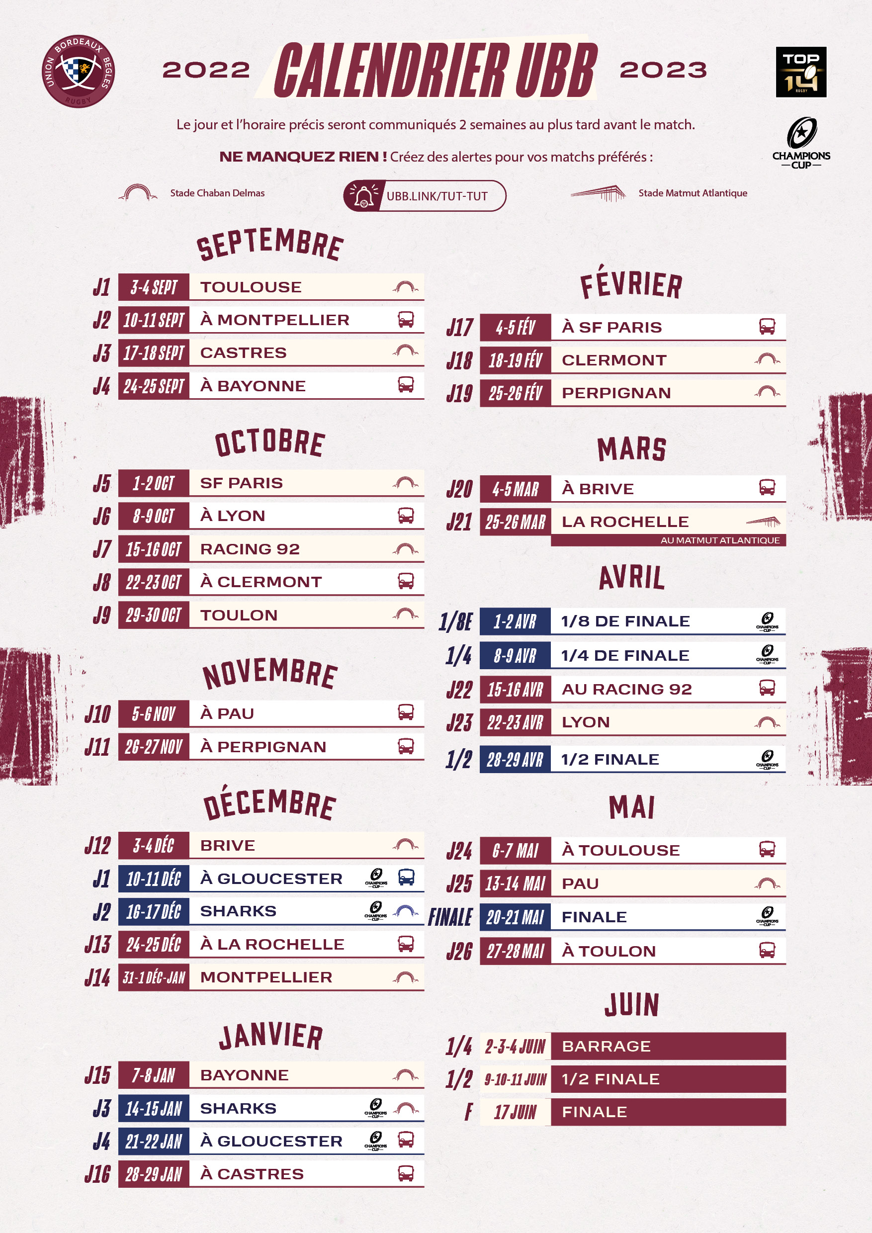 L'UBB débutera sa saison avec un déplacement sur la pelouse du Racing 92 avant de recevoir consécutivement Castres puis Toulon, avant la trêve internationale. Le Top 14 reprendra ses droits le lendemain de la finale de la Coupe du Monde, soit le dimanche 29 octobre pour la 4e journée de championnat, avec un déplacement pour nos girondins chez le Champion de France en titre.