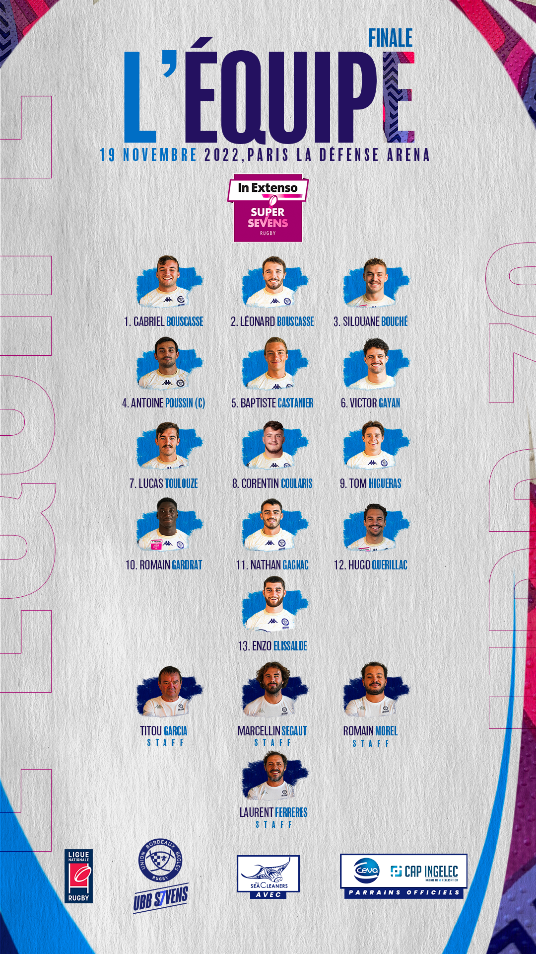 Découvrez la compo des 13 septistes alignés pour la finale de l'In Extenso Supersevens qui aura lieu ce samedi 19 novembre à partir de 14h39 face au Racing 92 Sevens.