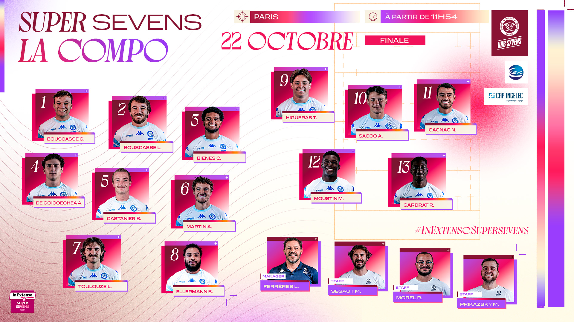 Grand départ pour notre équipe UBB Sevens qui se prépare pour la finale du Supersevens. Celle-ci aura lieu ce dimanche 22 octobre à Paris La Défense Arena. Laurent Ferrères et son staff ont dévoilé les 13 joueurs qui participeront au point d'orgue de cette belle saison. Bonus ? Un champion du monde fait partie du voyage.