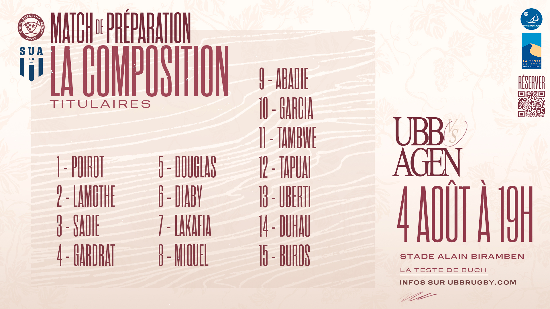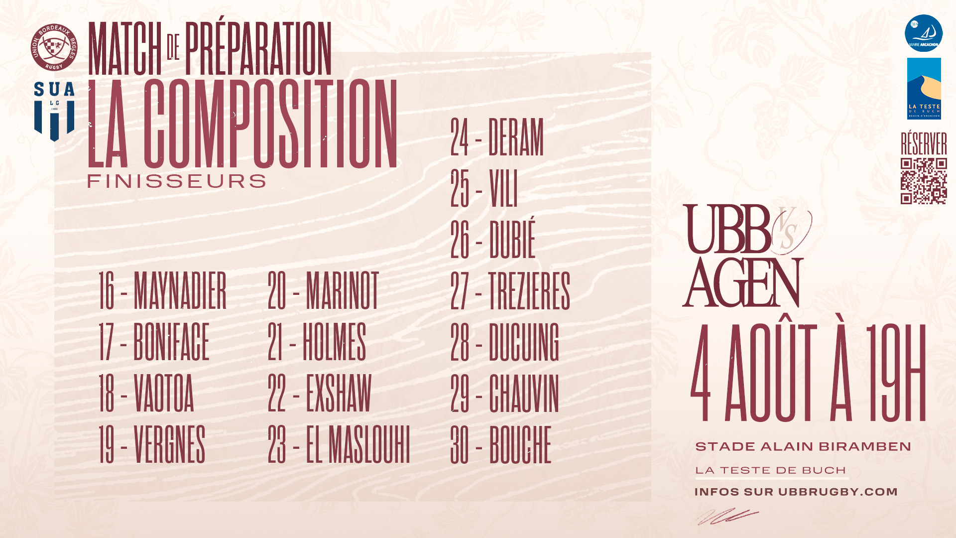 Ce vendredi 4 août, nos girondins disputeront leur premier des deux matchs de préparation planifiés cet été, face au SU Agen au stade Alain Biramben (plaine des sports) de La Teste-de-Buch (33). Pour cette première revue d'effectif, 30 joueurs seront alignés par le staff sportif de Yannick Bru. Les voici !