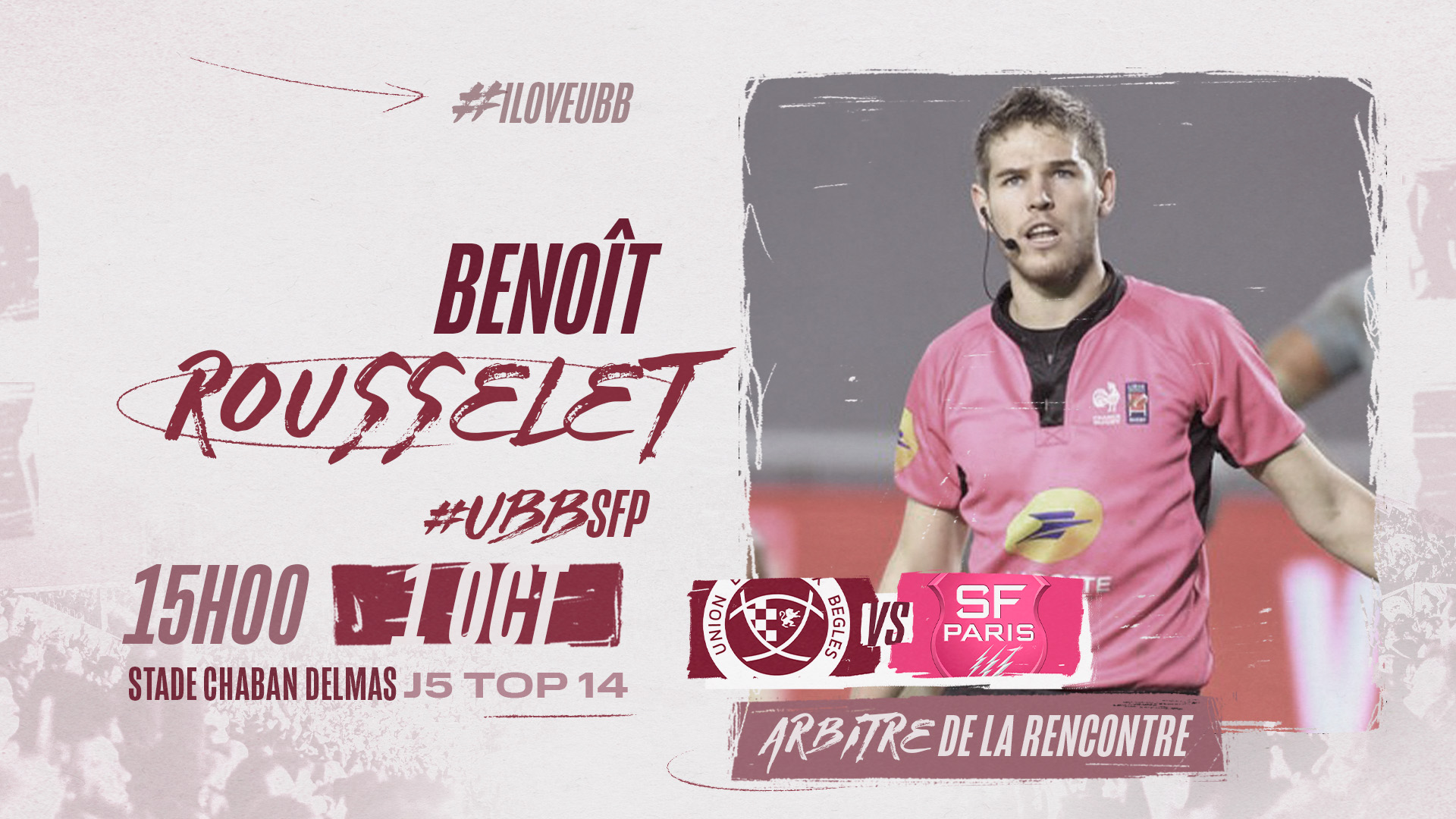 La LNR a désigné M. Rousselet pour l'arbitrage de UBB - Stade Français Paris, ce samedi 1 octobre à 15h00 à l'occasion de la 5ème journée de Top 14 à Chaban-Delmas.