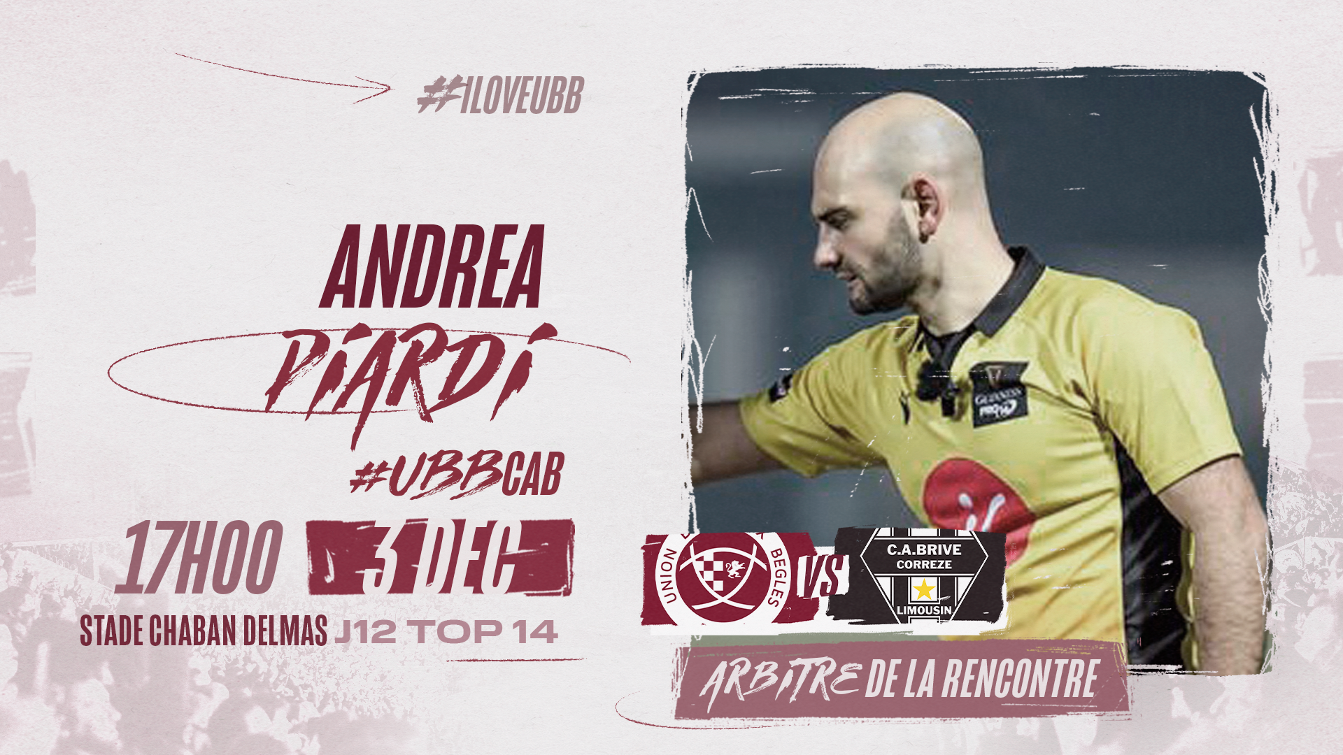 La LNR a désigné A. Piardi pour arbitrer UBB - CAB, ce samedi 3 décembre à 17h00 à l’occasion de 12ème journée de Top 14.