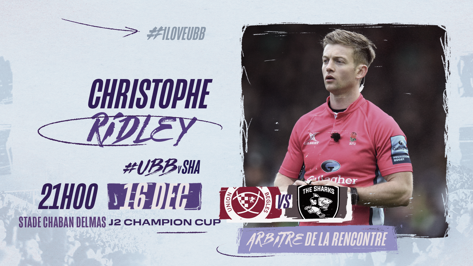 L'EPCR a désigné C. Ridley pour arbitrer UBB - Sharks, ce vendredi 16 décembre à 21h00 à l’occasion de 2ère journée de Champions Cup.