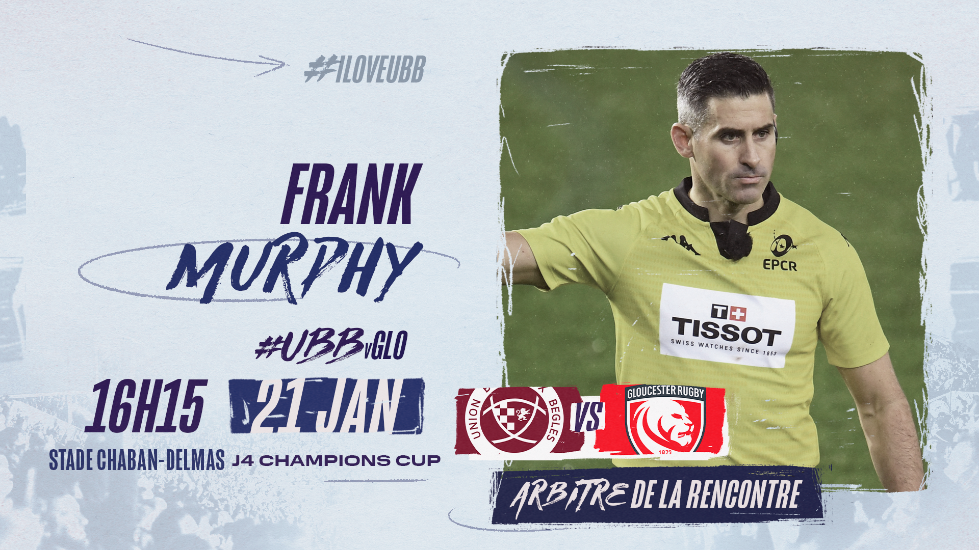 L'EPCR a désigné F. Murphy pour arbitrer UBB - Gloucester, ce samedi 21 janvier à l’occasion de la 4ème journée de Champions Cup.
