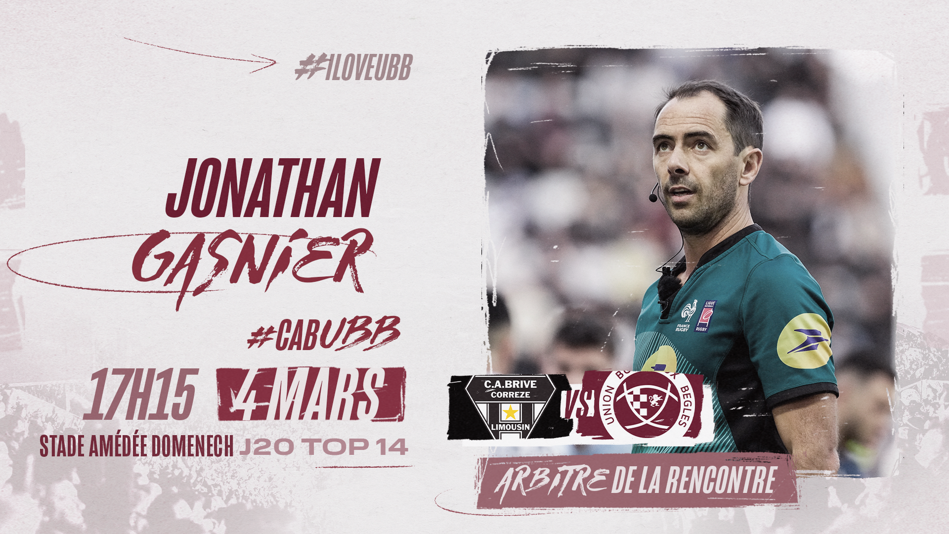 À l'occasion de la 20e journée de TOP 14, la LNR a désigné M. Jonathan Gasnier pour arbitrer Brive-UBB, ce samedi 4 mars au Stade Amédée Domenech.