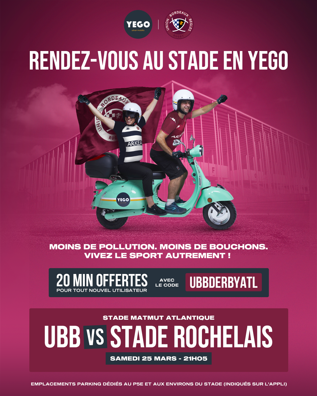 Depuis Bordeaux, Le Bouscat, Lormont, Cenon, Floirac, Bègles, Villenave d'Ornon, Gradignan, Pessac, Mérignac, Eysines, réservez un de 250 scooters électriques disponible sur l’application YEGO pour vous rendre au stade. En choisissant YEGO vous optez par un véhicule vert, polluant jusqu'à 9 fois moins qu'une voiture lors de votre trajet.