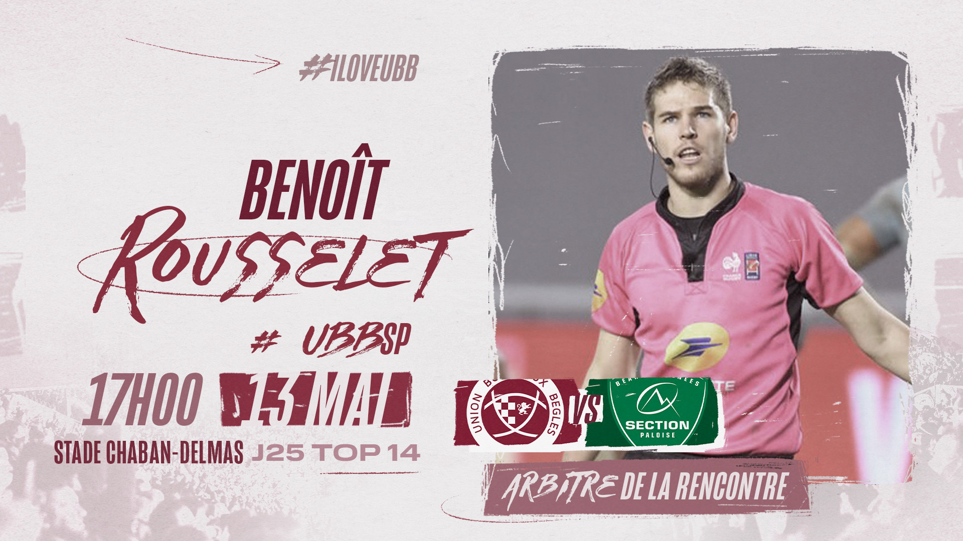 B. Rousselet dirigera la rencontre Union Bordeaux Bègles - Section Paloise, match comptant pour la 25e journée du TOP 14. Il sera assisté de T. Chereque et N. Bridoux sur les touches ainsi que de E. Briquet Campin à la vidéo.