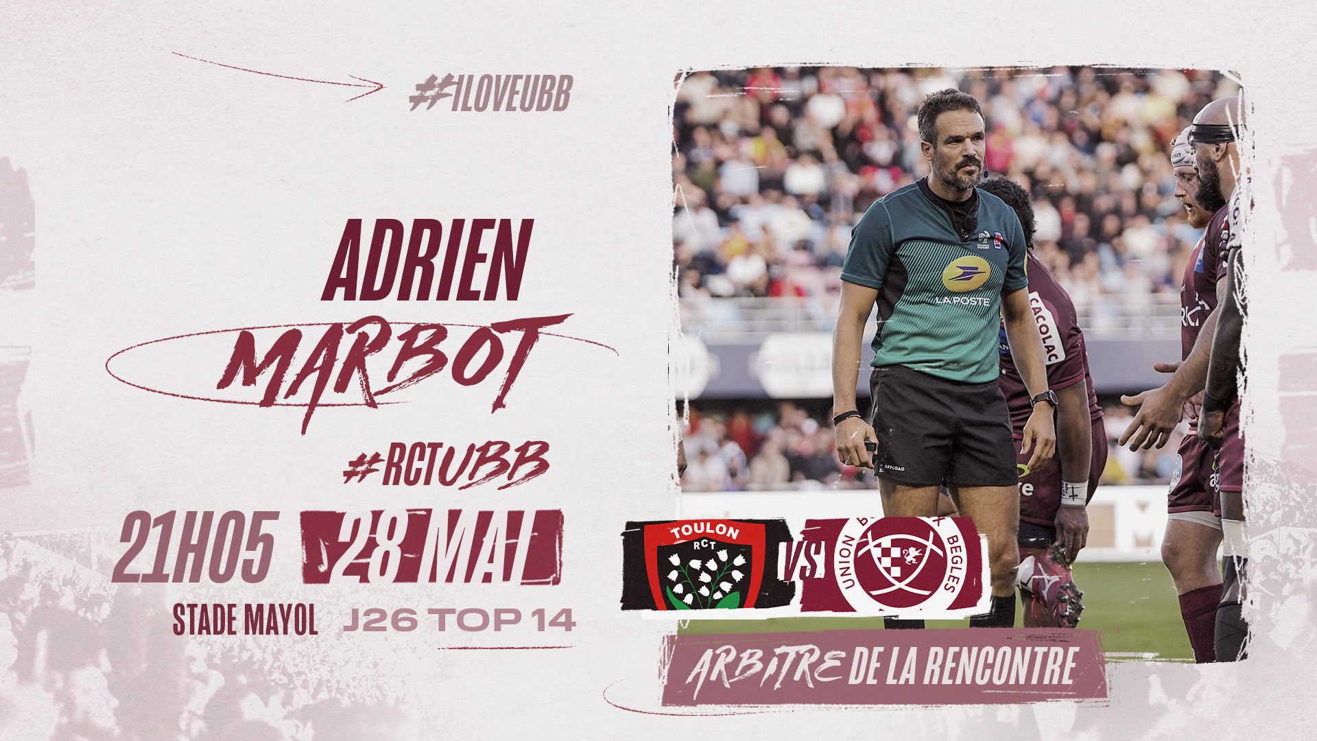 L'Union Bordeaux Bègles se déplace à Toulon pour disputer la 26e et dernière journée du TOP 14, qui verra comme traditionnellement tous les matchs se dérouler simultanément, ce dimanche 28 mai à 21h05. M. Adrien Marbot a été désigné pour diriger la rencontre à Mayol.