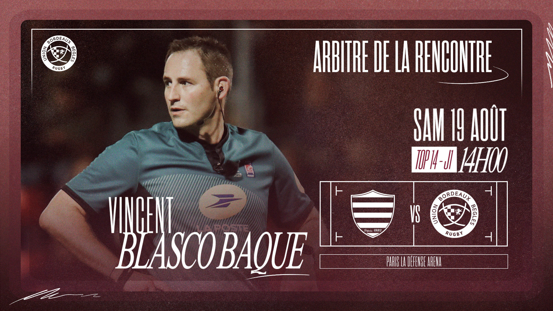 V. Blasco Baque dirigera cette première rencontre de l'UBB face au Racing 92. Il sera assisté de S. Coulon et S. Boyer sur les touches ainsi que de P. Pechambert à la vidéo.