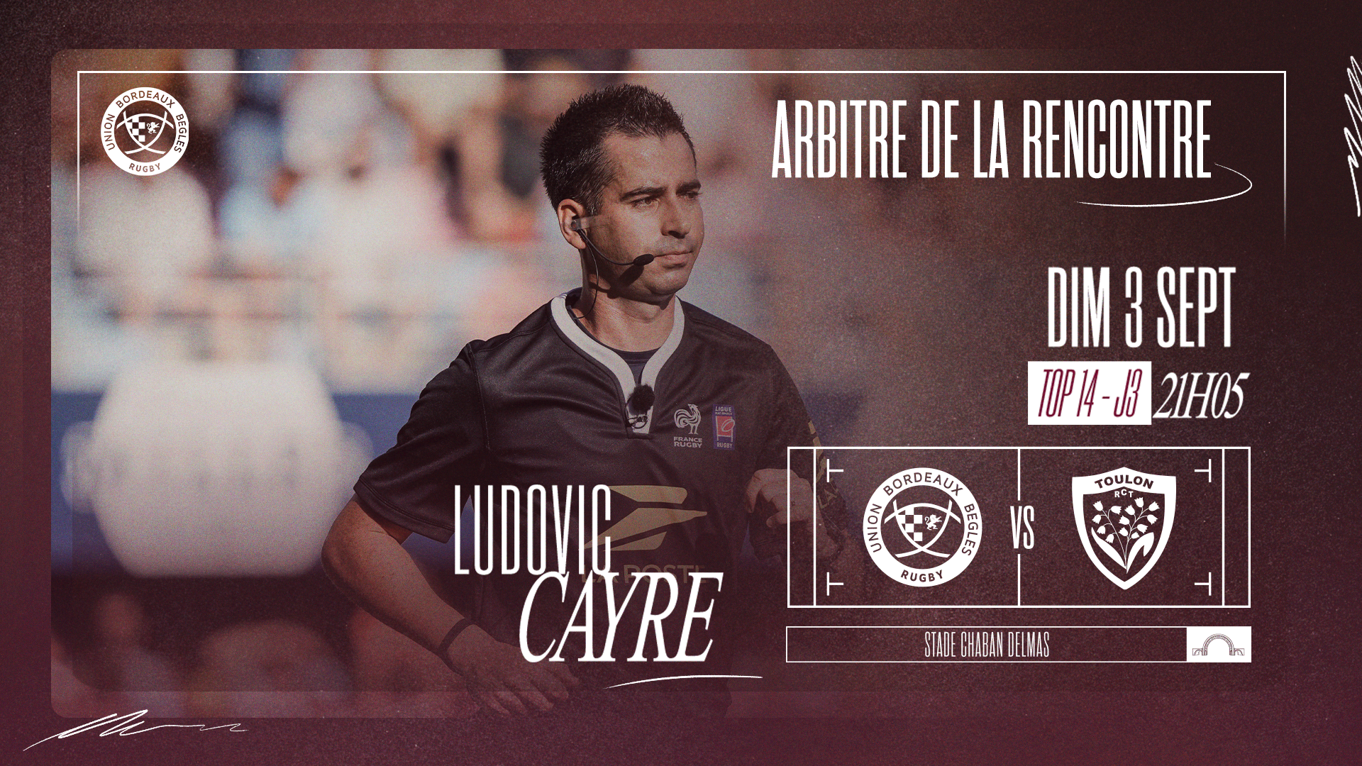 L. Cayre dirigera cette rencontre de l'UBB face à Toulon. Il sera assisté de T. Charabas et T. Mallet sur les touches ainsi que de D. Grenouillet à la vidéo.