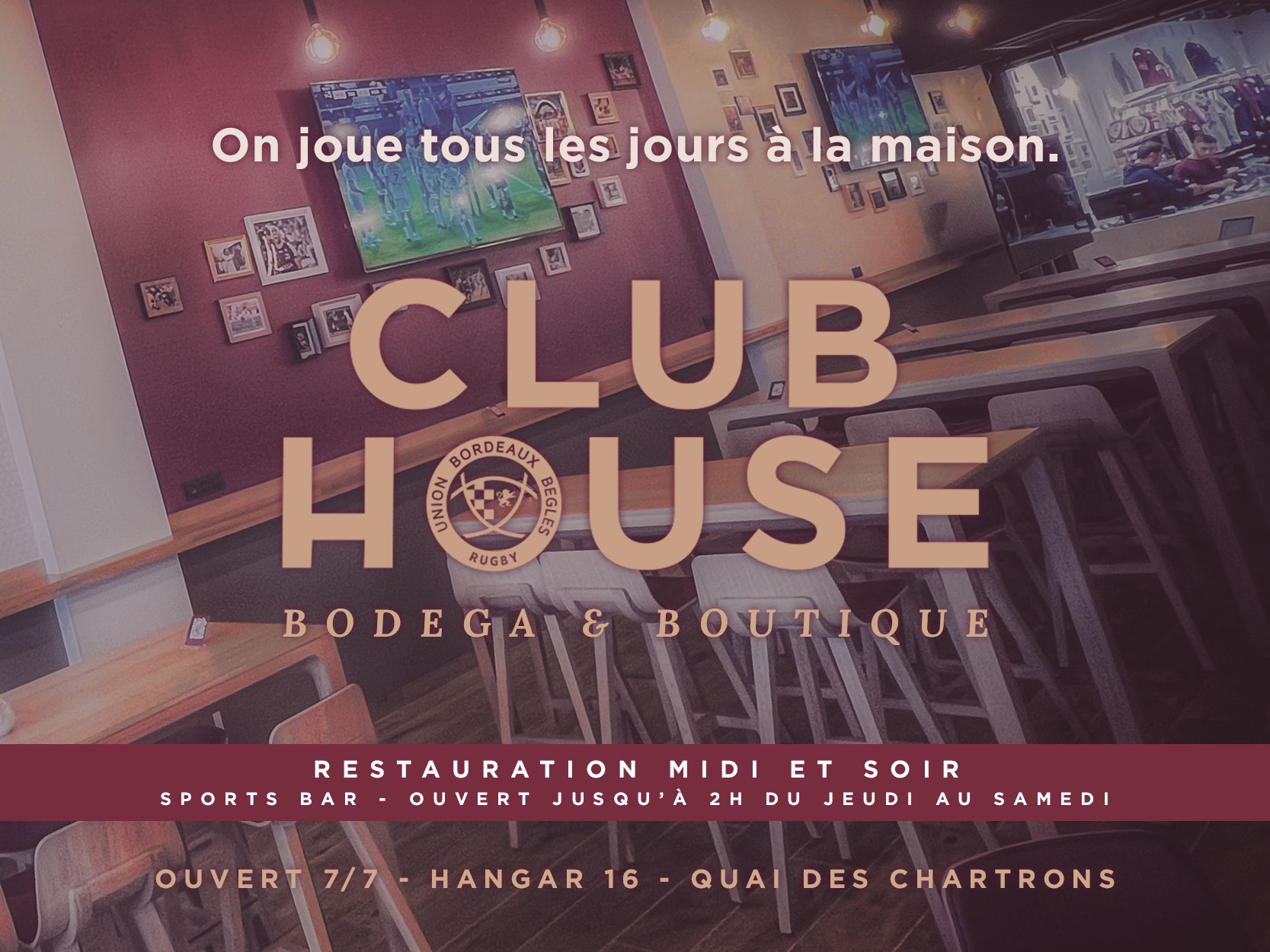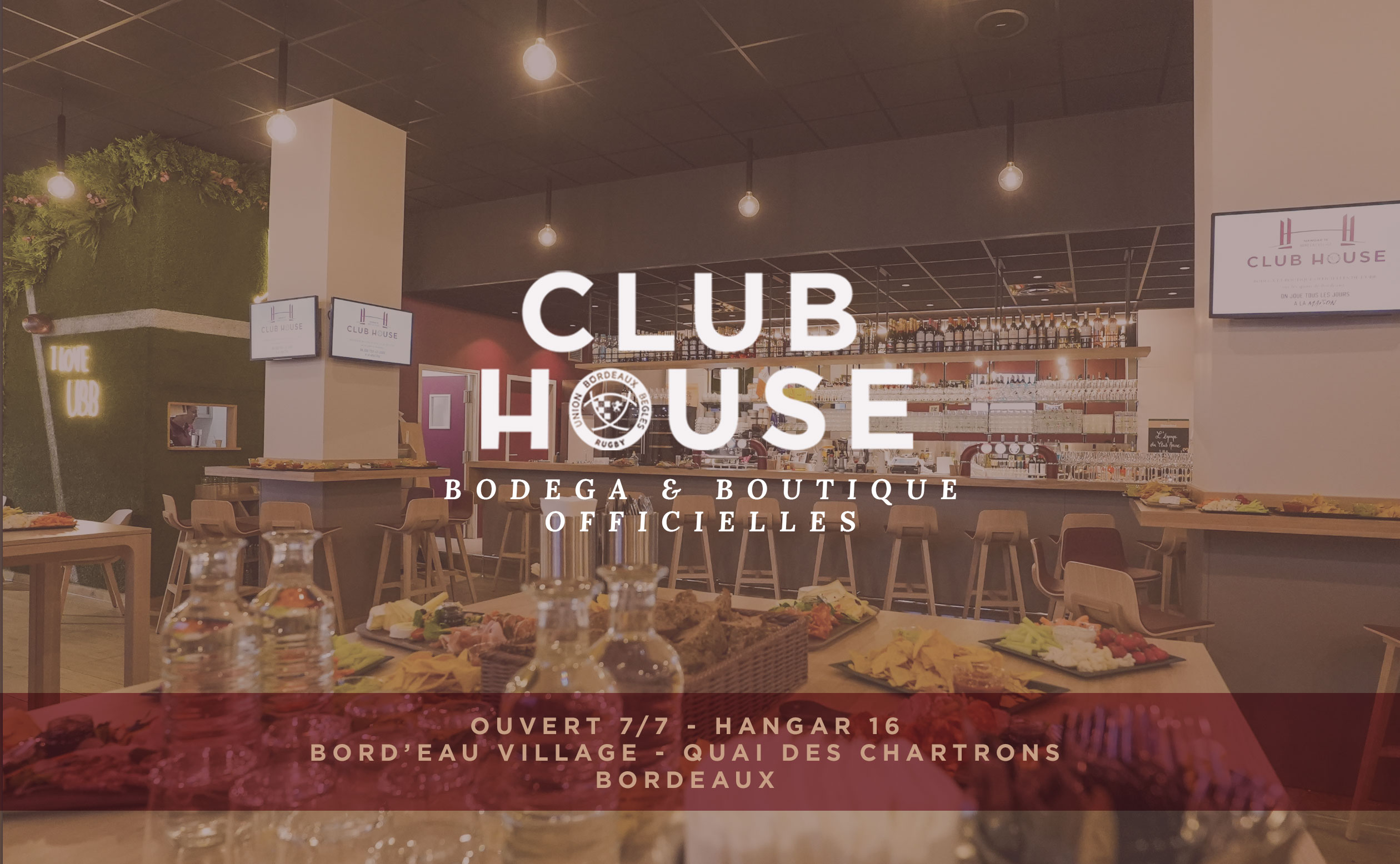 Ouvert depuis le 10 novembre, le Club House situé quai des Chartrons (Hangar 16) diffusera ce samedi son premier match "officiel" avec la retransmission en direct du match Perpignan - UBB à 15h00. Ambiance garantie !