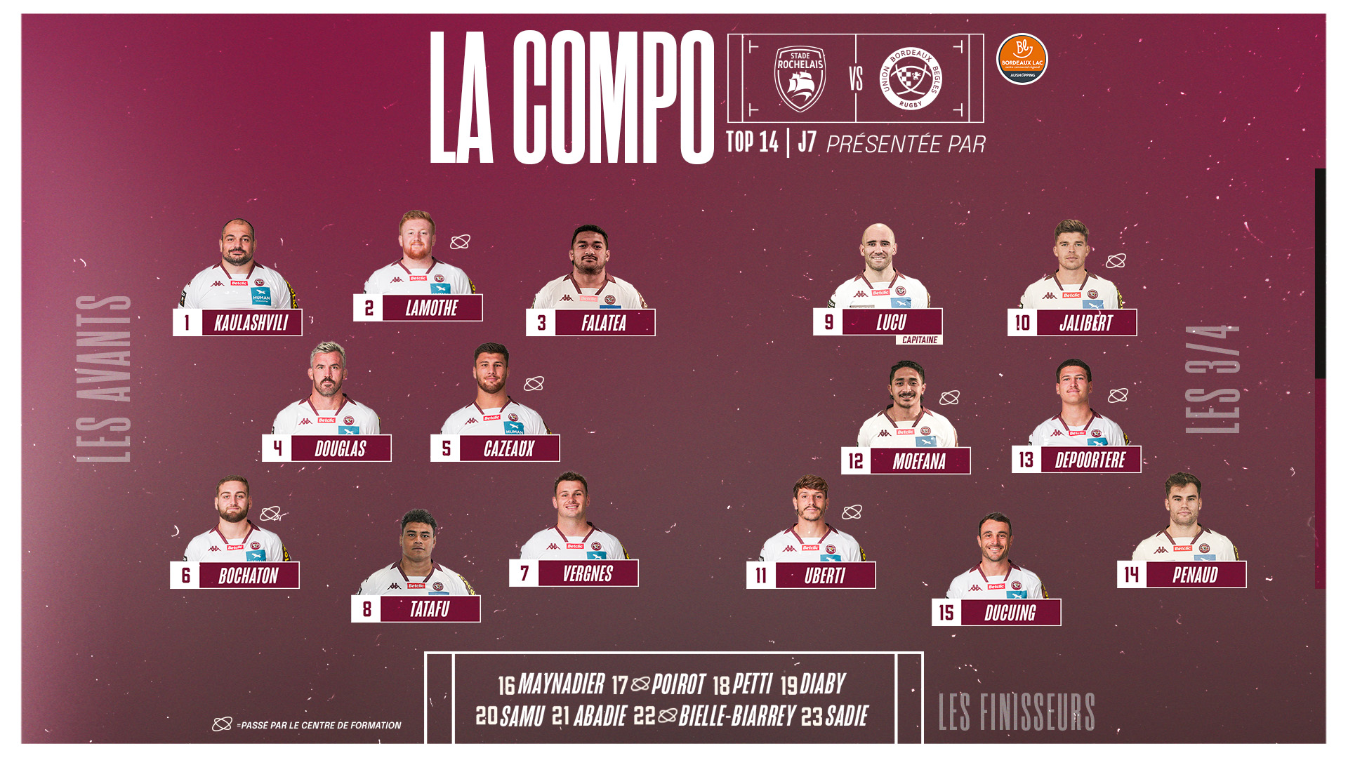 Voici le groupe des 23 girondins qui feront face aux maritimes ce dimanche soir. Après un début de saison compliqué les rochelais ont renoué avec la victoire la semaine passée face aux bayonnais. L'UBB quant à elle est toujours en quête d'une victoire à l'exterieur pour concrétiser son début de saison.