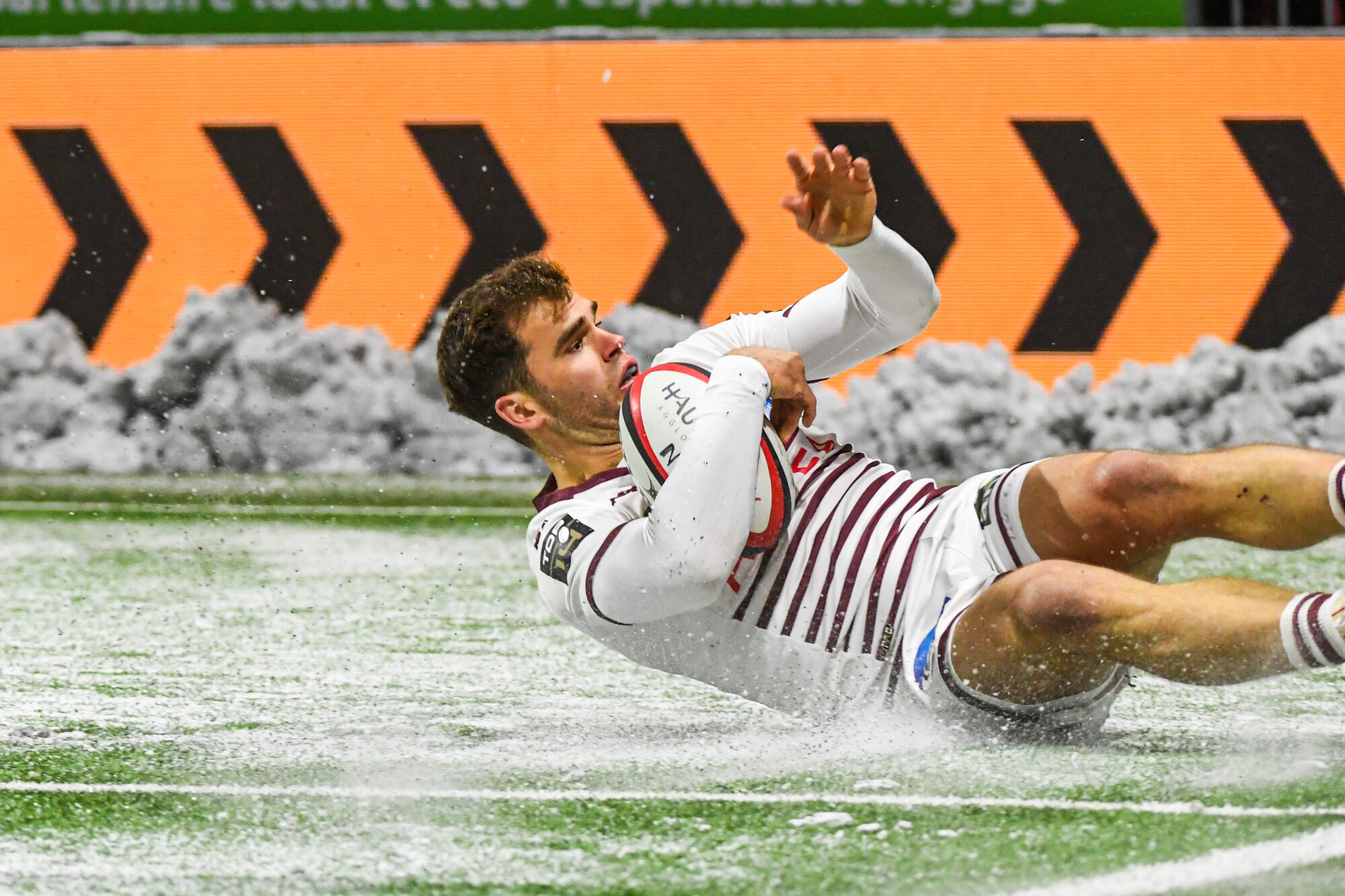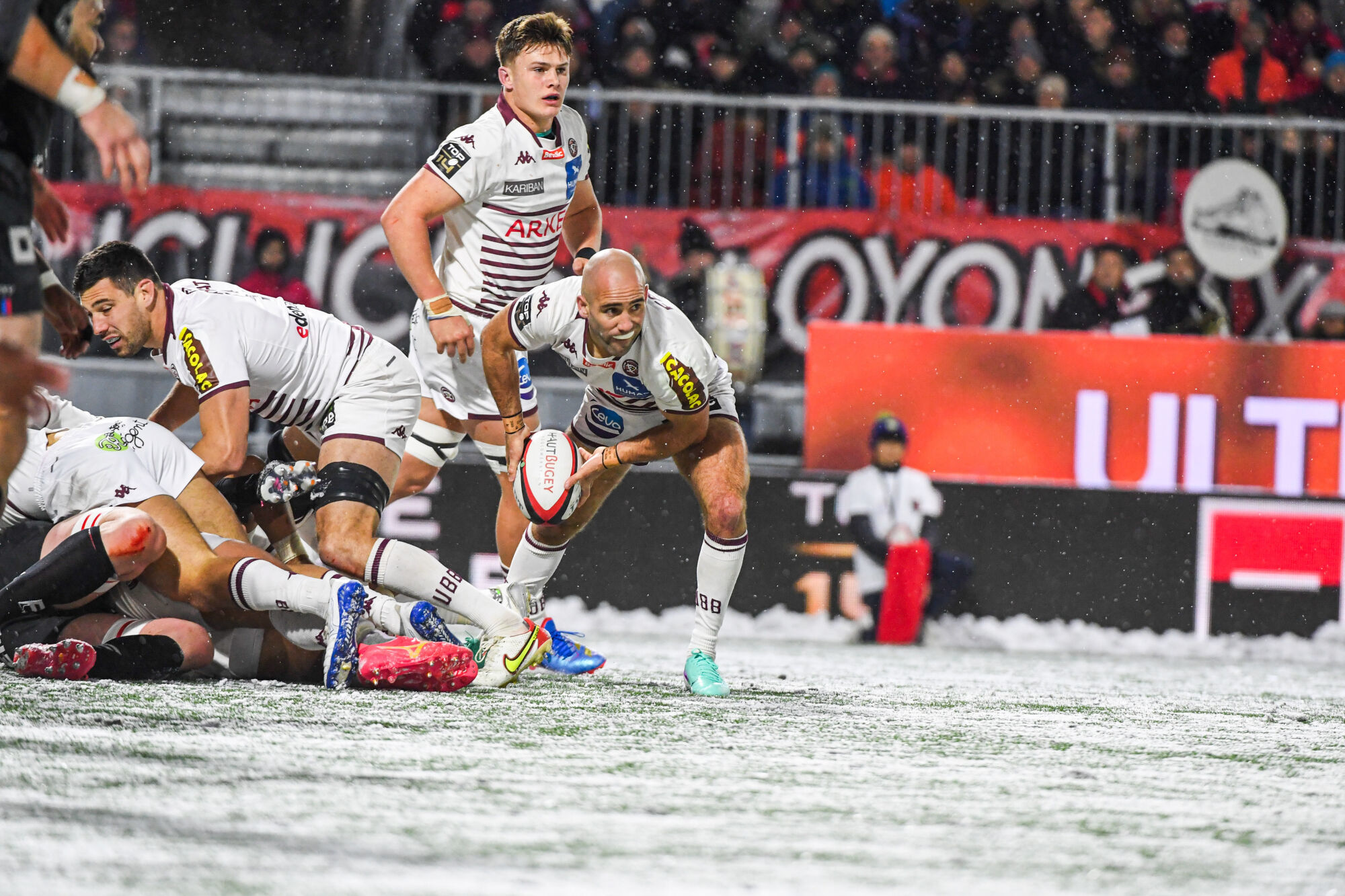 Soirée blanche à Oyonnax. Avec une neige collante au sol et une équipe girondine en tenue blanche, le spectateur de Rugby + n'était pas gâté aujourd'hui. Allait-il l'être en terme de spectacle, dans de telles conditions ?