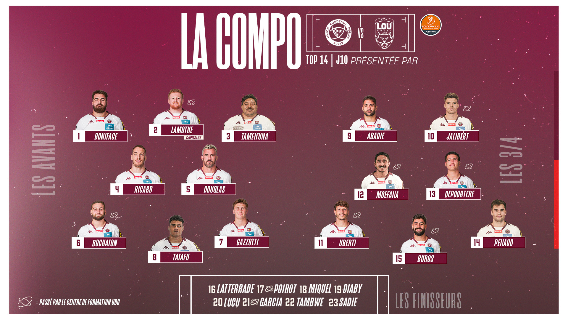 Fin de cette belle année 2023 demain soir à Chaban pour la dernière rencontre de TOP 14 qui se jouera face aux Lyonnais. Rendez-vous donc ce vendredi soir à 21h pour cette 10e journée. Voici la composition de vos 23 Bordeaux & Blanc.