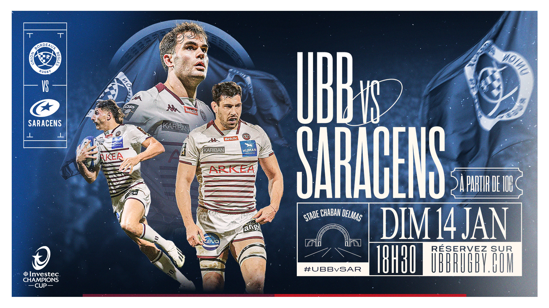 Ne manquez pas la 3e journée de l'Investec Champions Cup à Chaban : dimanche 14 janvier à 18h30, l'UBB affronte les Anglais des Saracens, triples champions d'Europe ! Encore quelques milliers de billets à saisir :