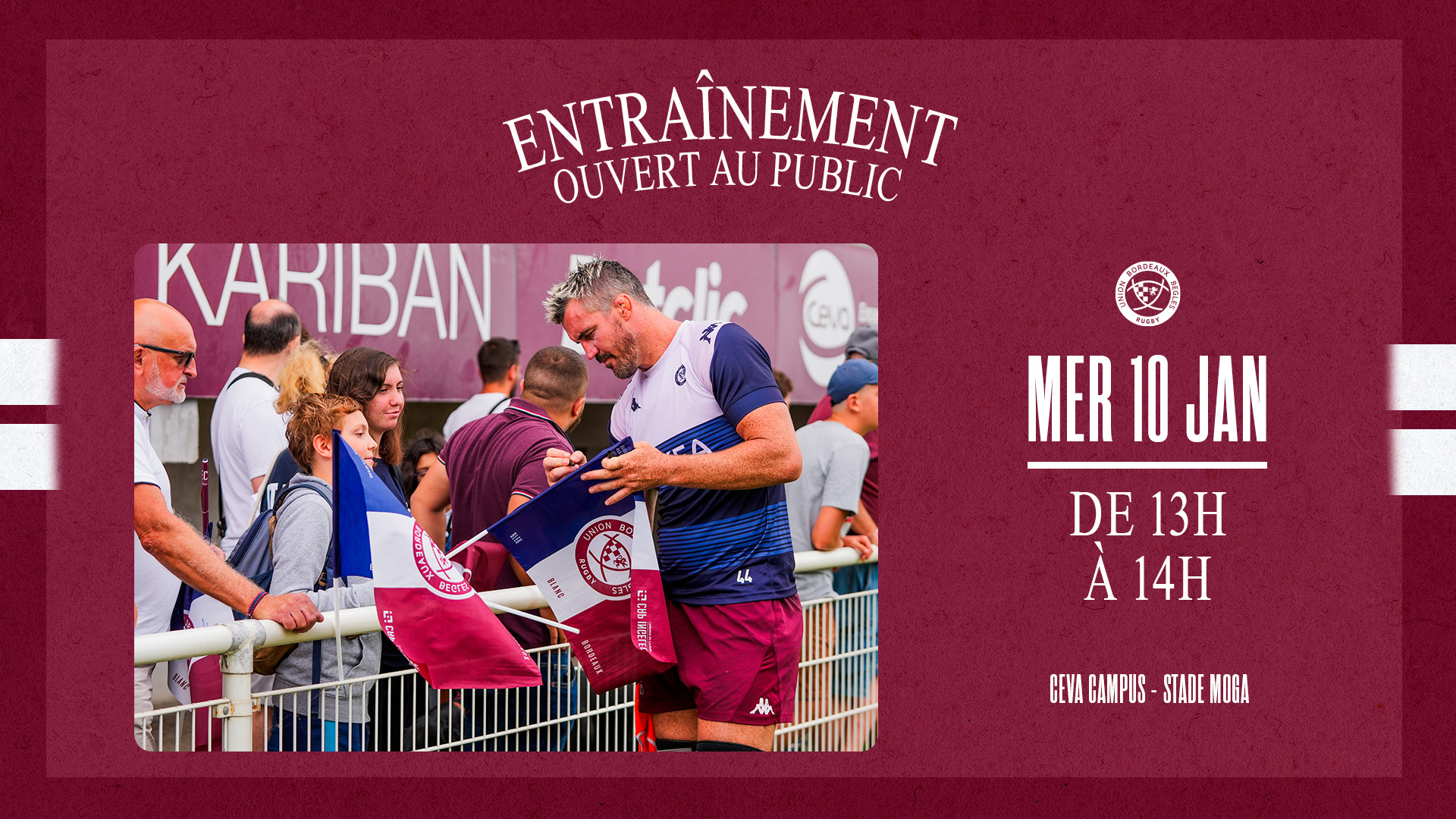 Mercredi 10 janvier, de 13h à 14h15, retrouvez vos joueurs pour le premier entraînement ouvert au public de l'année au CEVA Campus – Stade Moga. Venez encourager vos joueurs avant le choc face aux Saracens ce dimanche !