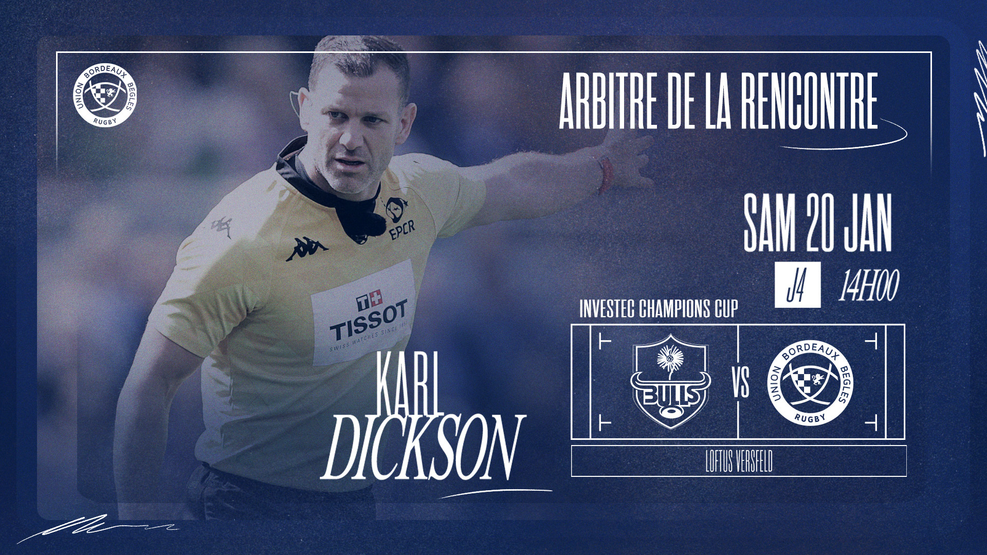 K. Dickson dirigera cette J4 de l'Investec Champions Cup face aux Bulls ce samedi 20 janvier à 14h (heure française). Il sera assisté de A. Leal et J. Meredith sur les touches et de M. Liperini à la vidéo.