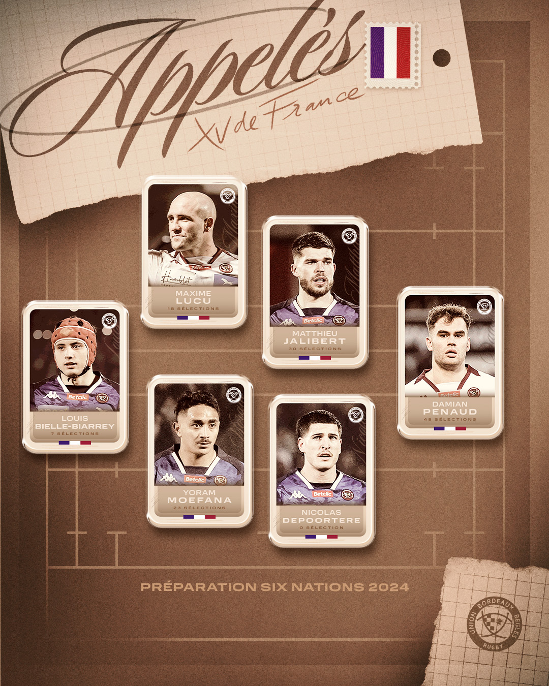 Matthieu Jalibert, Maxime Lucu, Yoram Moefana, Damian Penaud, Nicolas Depoortere et Louis Bielle-Barrey rejoindront le centre d'entraînement du XV de France à Marcoussis la semaine prochaine pour un premier rassemblement.