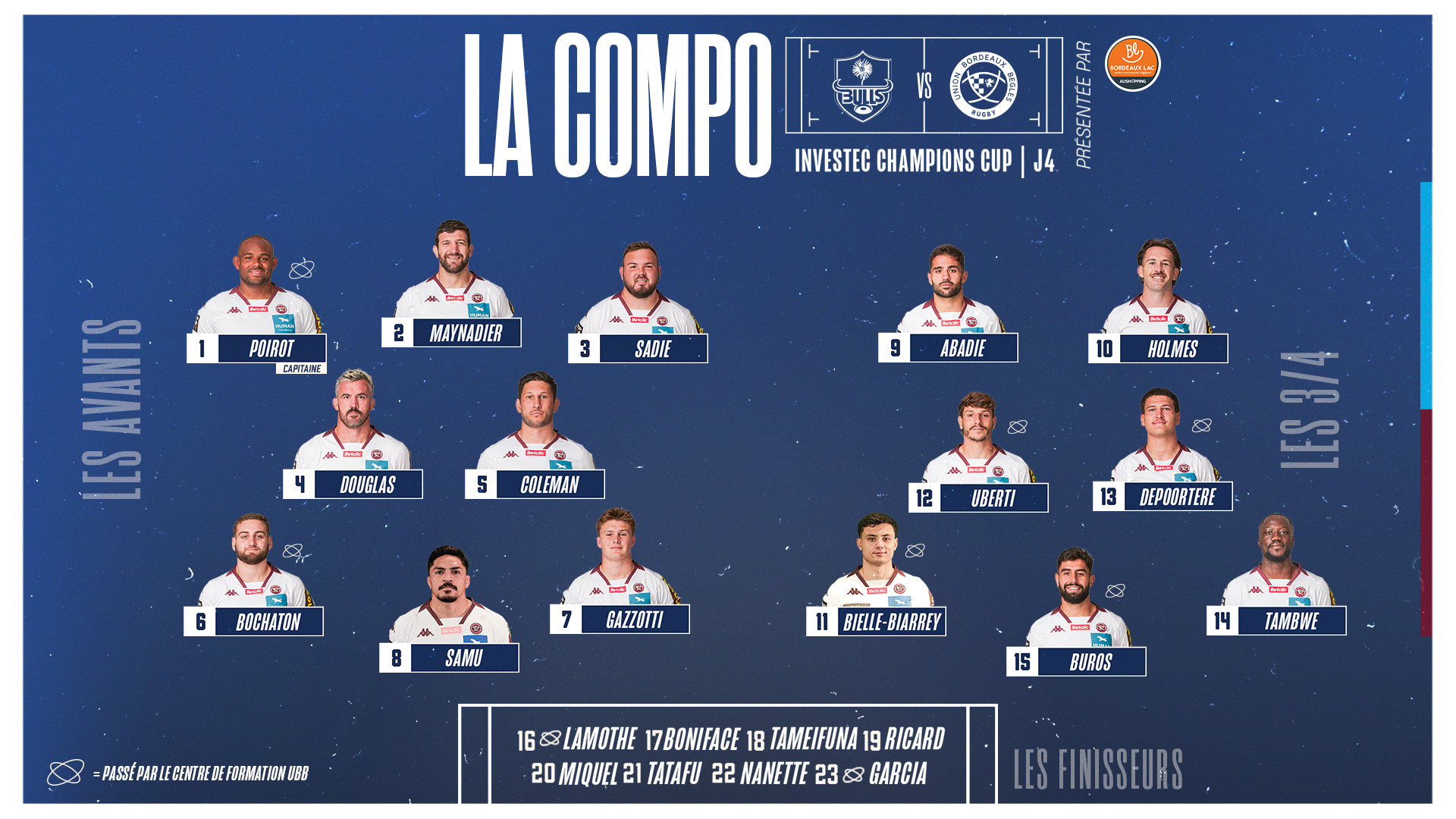 Encore du changement pour ce 4ème et dernier match de la phase de poule ! Pas moins de 7 titulaires cèdent leur place pour ce match face aux Vodacom Bulls. Une première ligne d'expérience a été préférée par Yannick Bru et son staff sportif, Jefferson Poirot et Carlü Sadie encadreront Clément Maynadier. Ça bouge également du côté des arrières. La charnière est totalement modifiée avec Paul Abadie et Zack Holmes. Pablo Uberti fera sa première apparition de la saison au poste de premier centre et Madosh Tambwe est à retrouver sur l'aile droite.