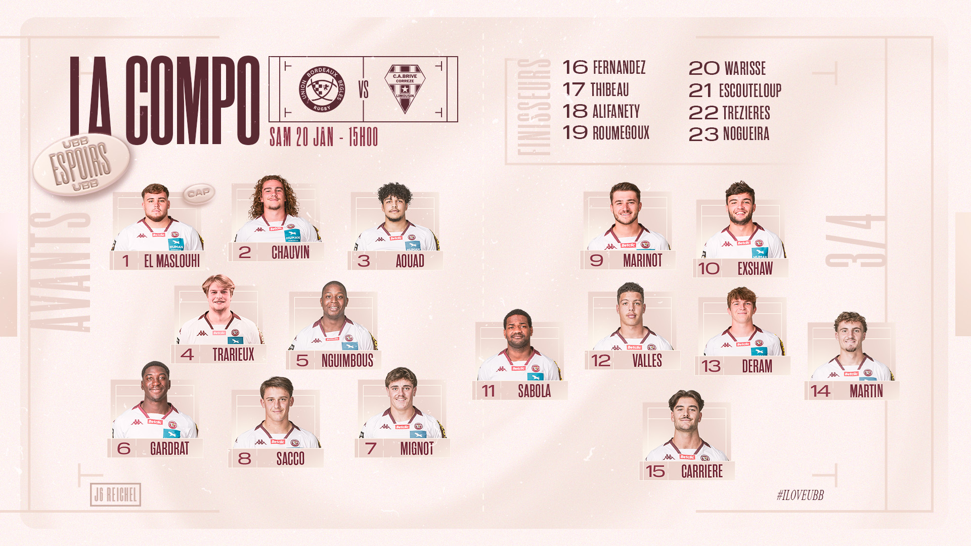 Après une pause de près d'un mois sans match, les Espoirs reprennent le chemin des terrains et affronteront le CA Brive ce samedi 20 janvier au CEVA Campus - Stade Moga. Retrouvez dès à présent la composition :