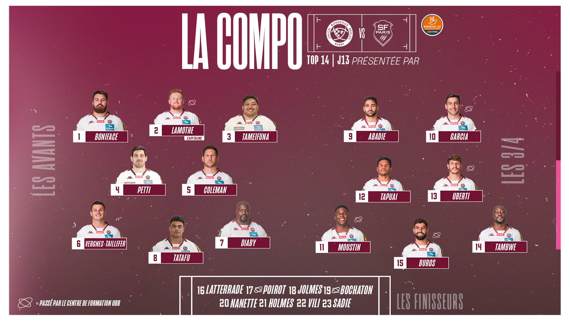 Qui dit 13e journée de TOP 14 dit dernière journée de cette phase aller. Voici la composition des 23 Bordeaux & Blanc qui feront face aux soldats rose ce samedi après-midi à 15h05 :
