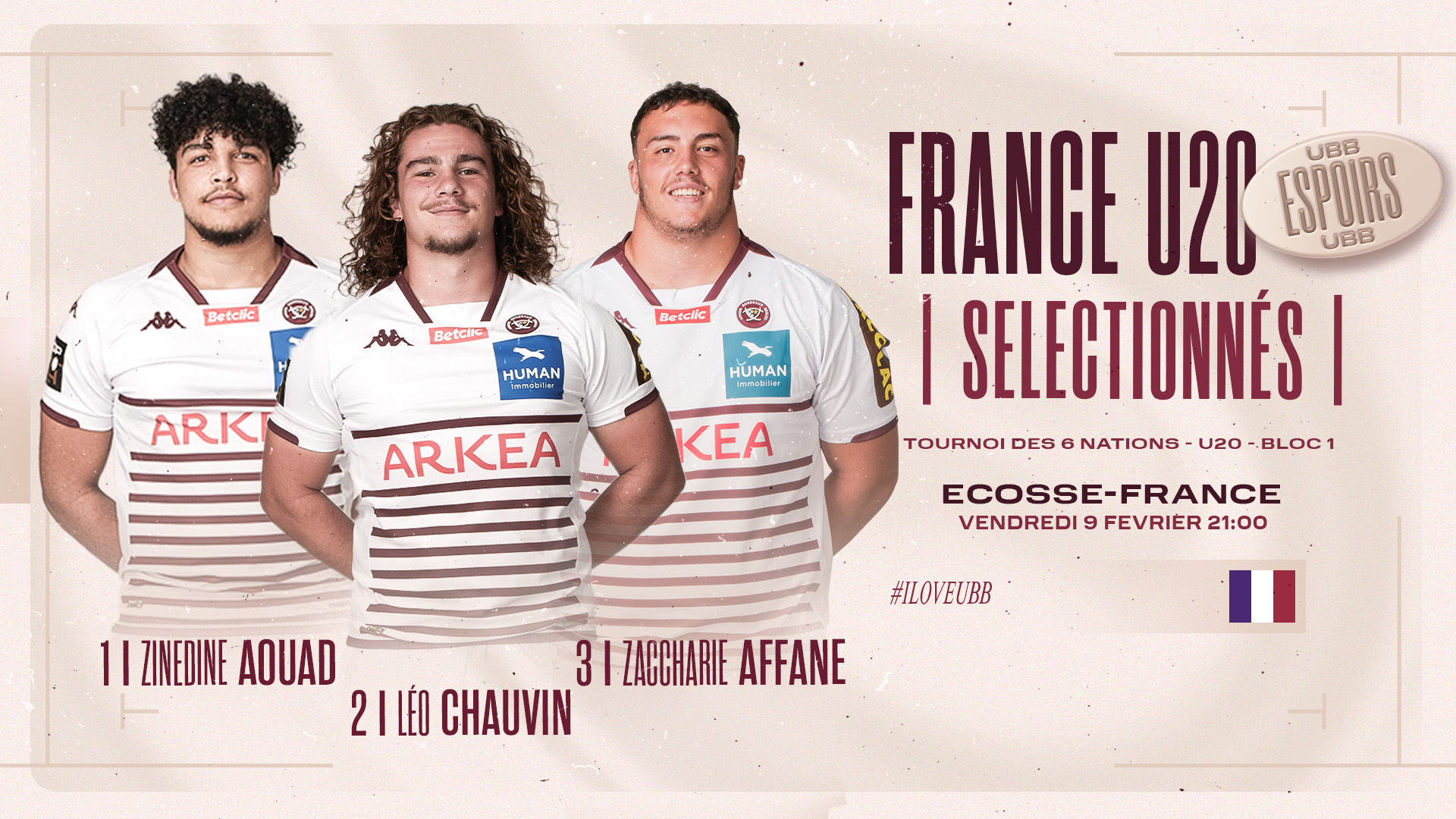 À cet effet, c'est une première ligne 100% girondine qui débutera face aux jeunes pousses du XV du Chardon. Après avoir obtenu sa première cape le week-end dernier face à Toulon, Zaccharie Affane a rejoint ses coéquipiers en début de semaine pour préparer ce premier déplacement des 6 Nations. Zinédine Aouad (1), Léo Chauvin (2) et Zaccharie Affane (3) seront ainsi alignés ensemble, pour la première fois, en bleu sur la pelouse du DAM Health Stadium. Une belle première partie de ce week-end avant la prestation du XV de France qui aura lieu le lendemain à 21 heures à Murrayfield.