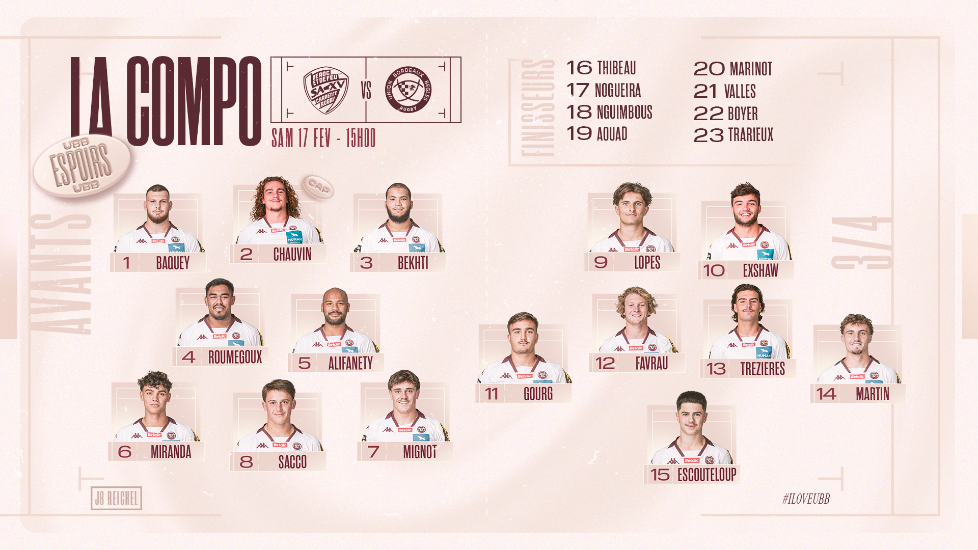 Après une victoire à domicile face à Bayonne le week-end dernier (22-10), nos jeunes pousses font le déplacement en terre charentaise ce samedi 17 février. Le match se jouera au Stade De Chanzy à 15h.