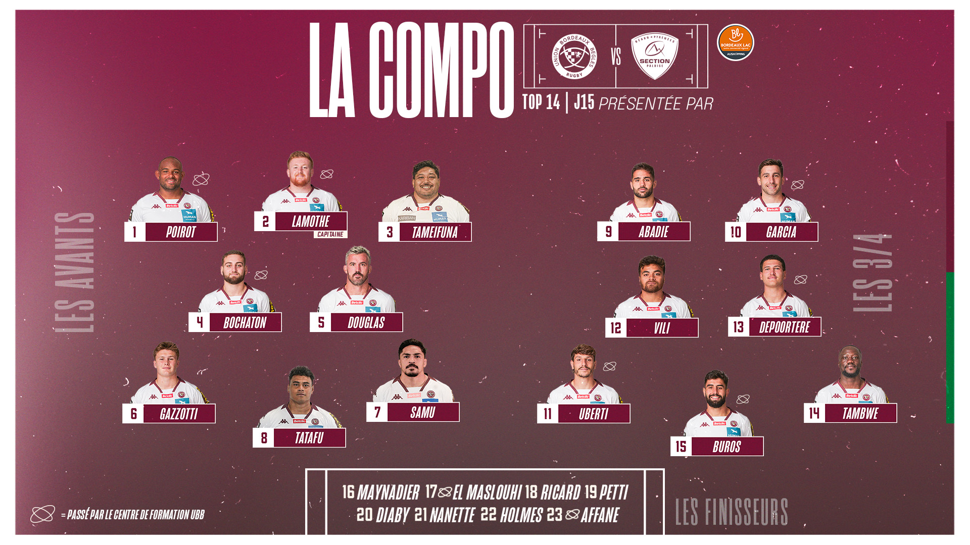 Nos Girondins accueillent la Section Paloise Béarn Pyrénées pour cette 15e journée de TOP 14 qui aura lieu ce samedi 17 février à 17h. Yannick Bru et son staff sportif ont dévoilé la composition d'équipe.
